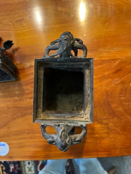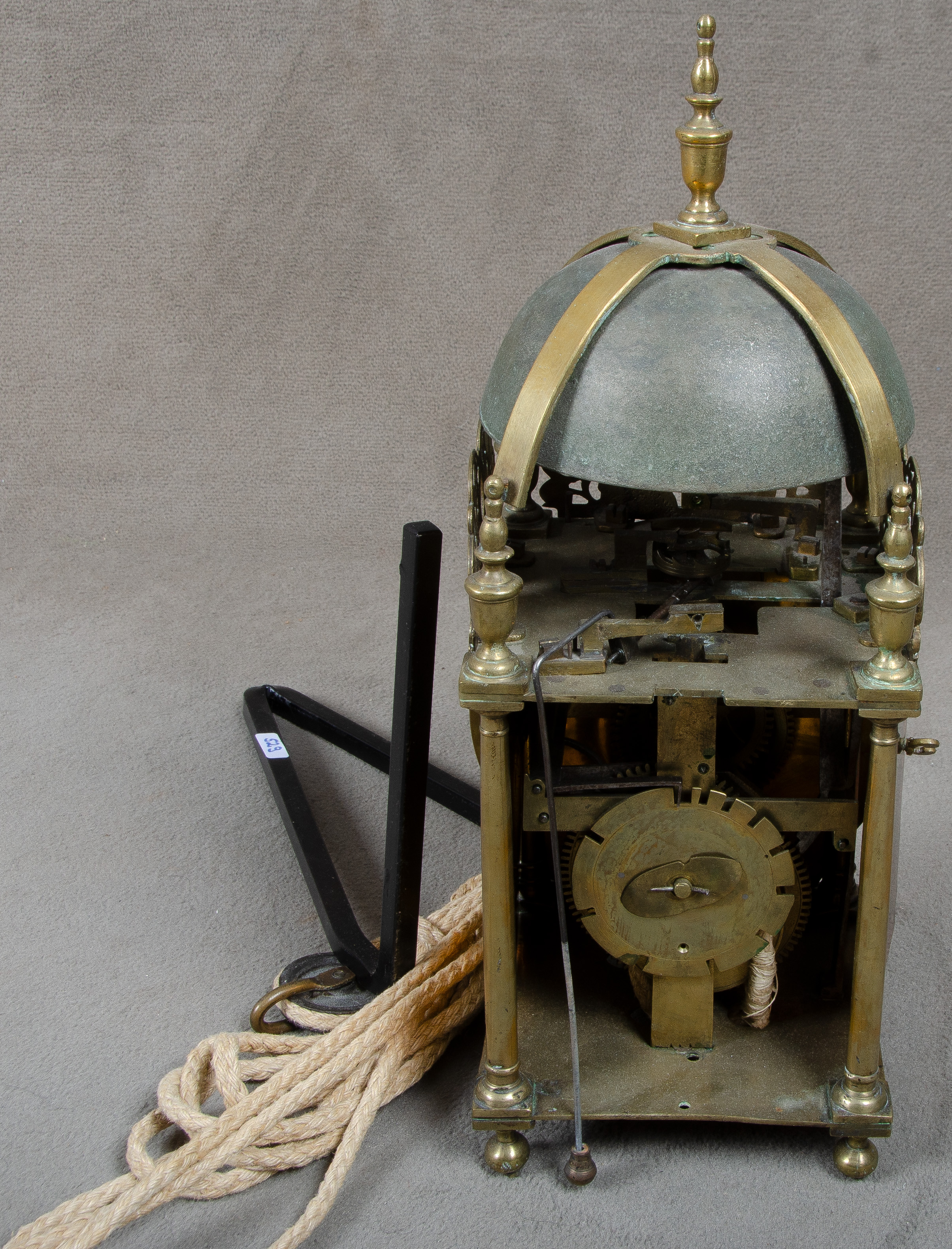 - Katalog-Nr: 529Laternenuhr. London, Thomas Wheeler 17. Jh. Bronze, mit gusseiserner Glocke und Messingzifferblatt, oberhalb beschriftet: „Thomas Wheeler neare ye French Church London“, H=38,5 cm, B=14 cm, T=14,5 cm. (Funktion ungeprüft)o.L.