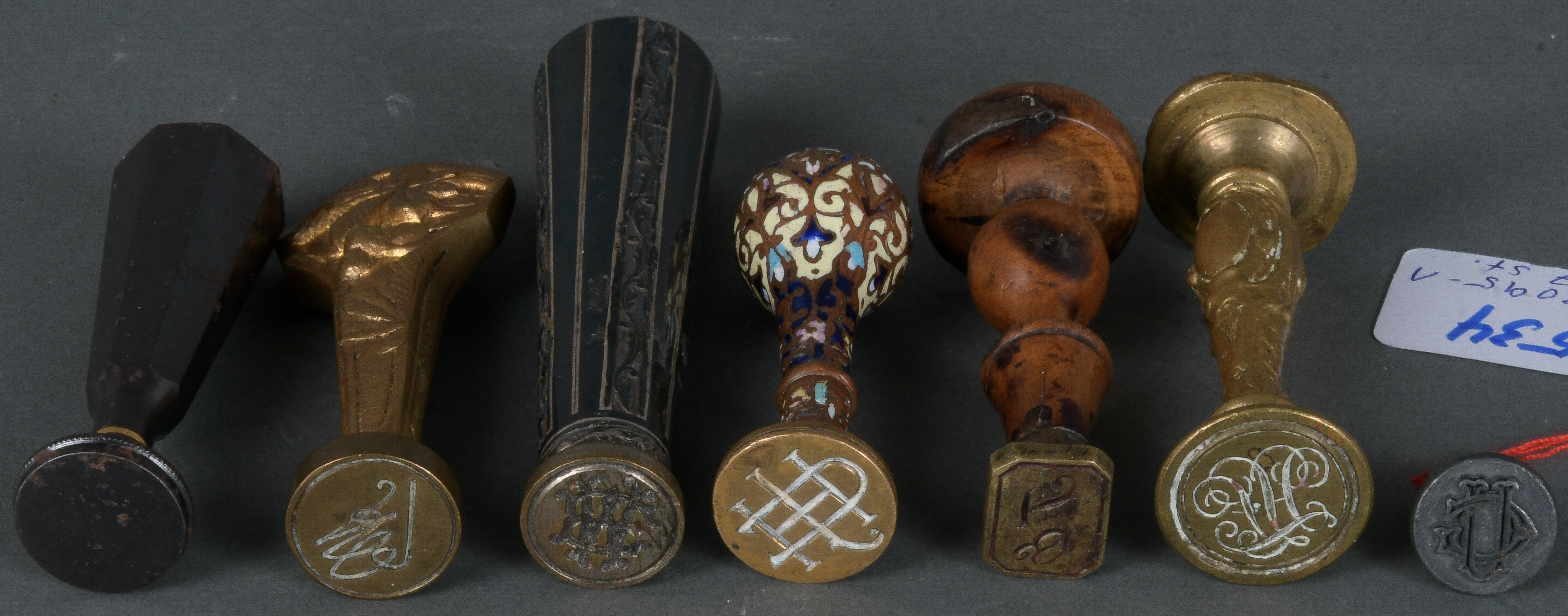 - Katalog-Nr: 534Siebentlgs. Konvolut Petschaften. England / Deutschland 19./20. Jh. Bronze / Email / Holz / Silber, H=2,2 bis 9,7 cm.o.L.