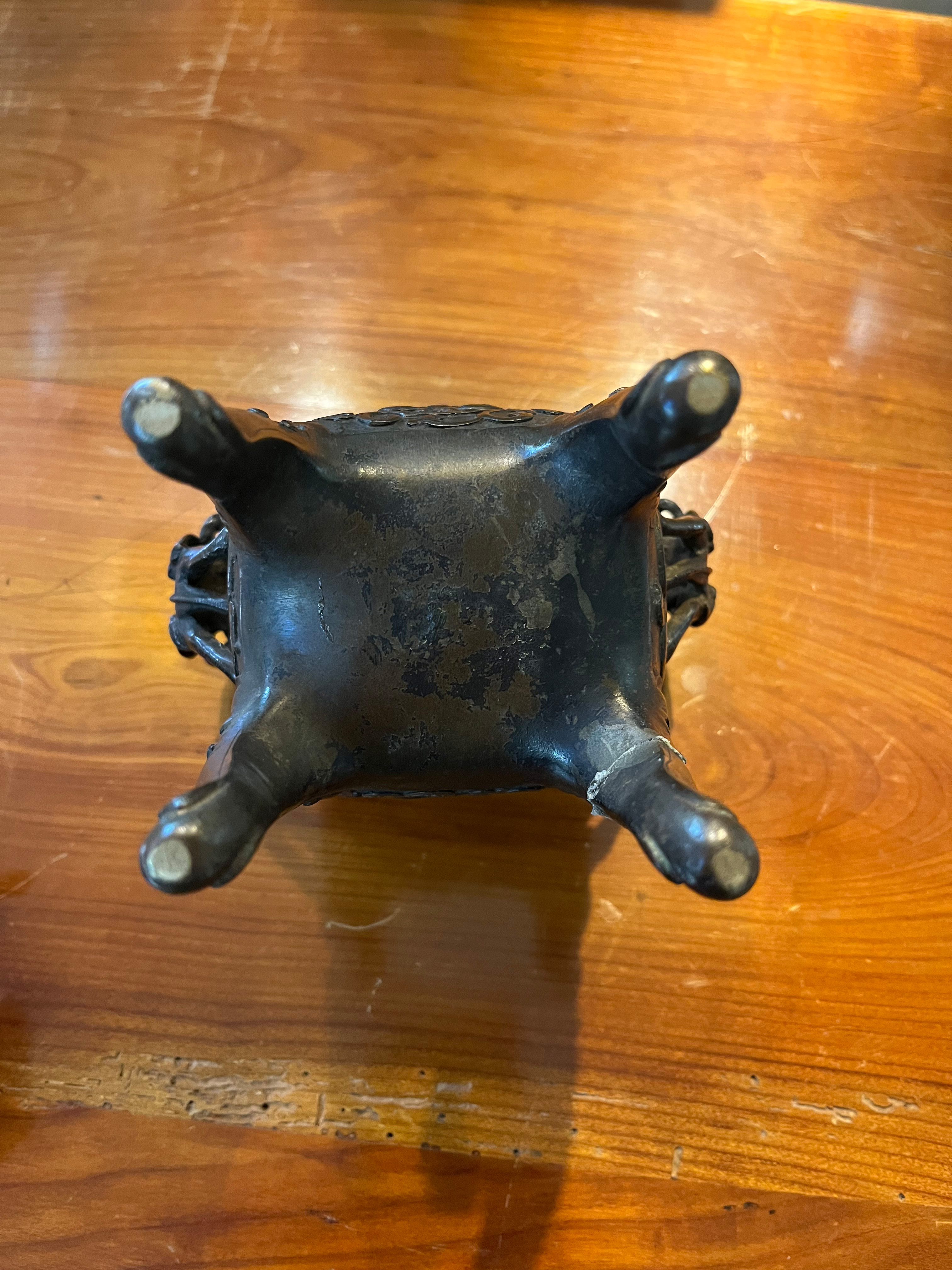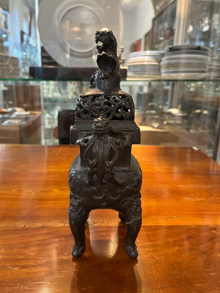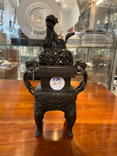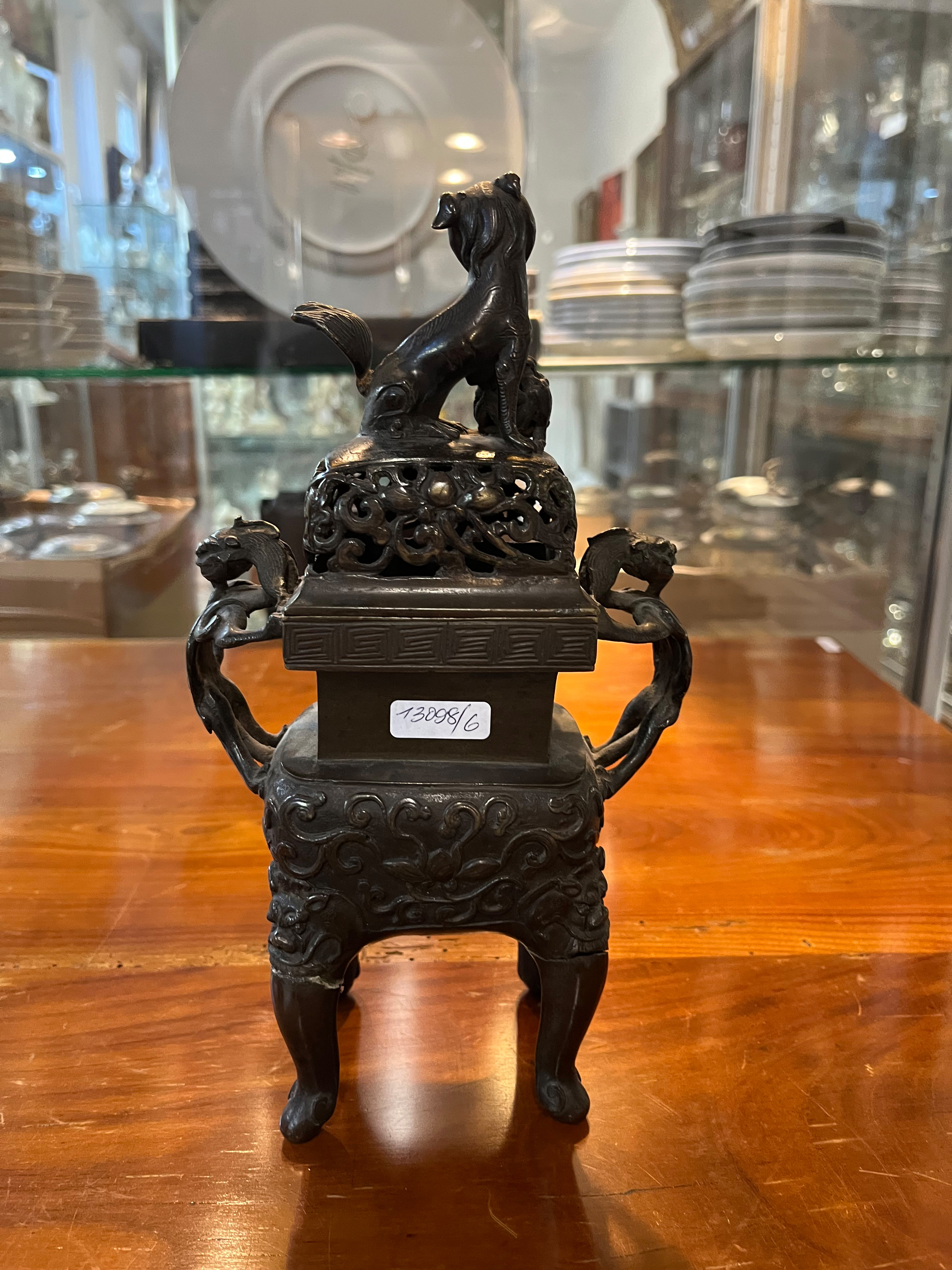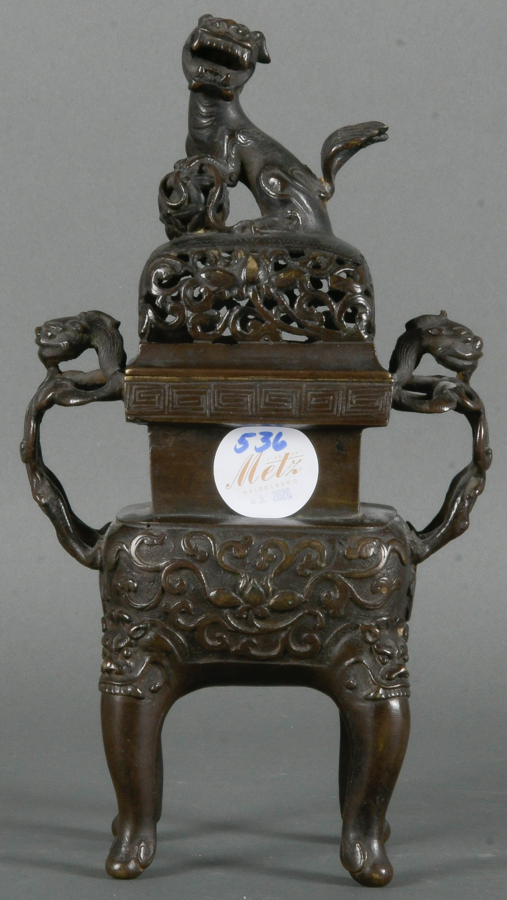 - Katalog-Nr: 536Räucherdeckelgefäß. Asien. Bronze, reliefiert, teilw. durchbrochen, H=26 cm. (ein Fuß geklebt)o.L.