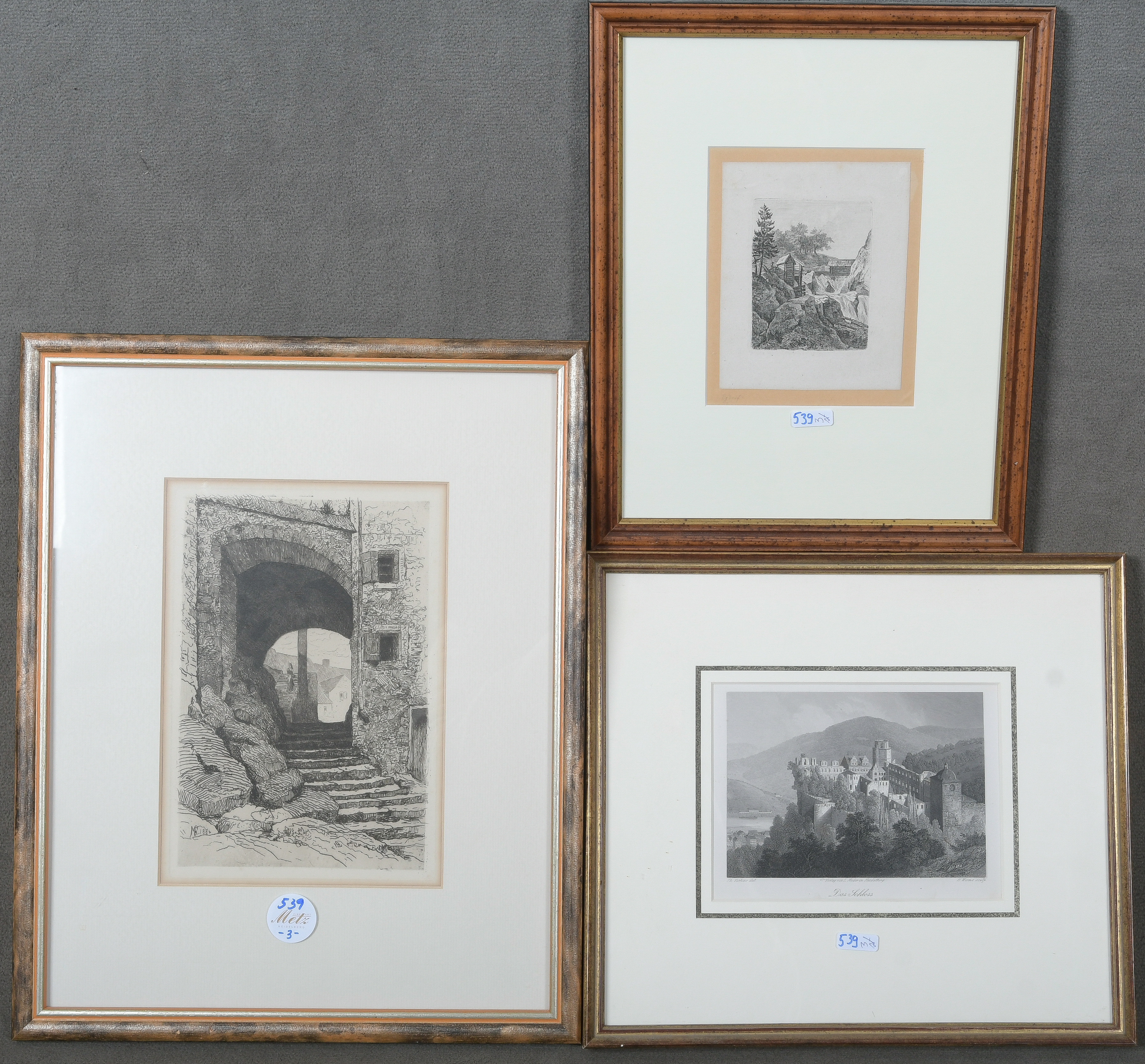 - Katalog-Nr: 539Dreitlgs. Konvolut Graphik: Julius Schrag (1864-1946). „Gasse“. Radierung, li./u./monogr./dat. 1884 (22,5 x 15 cm); Theodor Verhas (1811-1872). Ansicht des Heidelberger Schlosses. Stahlstich, li./u./sign. (11 x 16 cm); Graphiker des 19. Jhs. Gebirgslandschaft mit Sturzbach. Stahlstich, li./u./sign. (9 x 8 cm). Je hi./Gl. gerahmt.o.L.