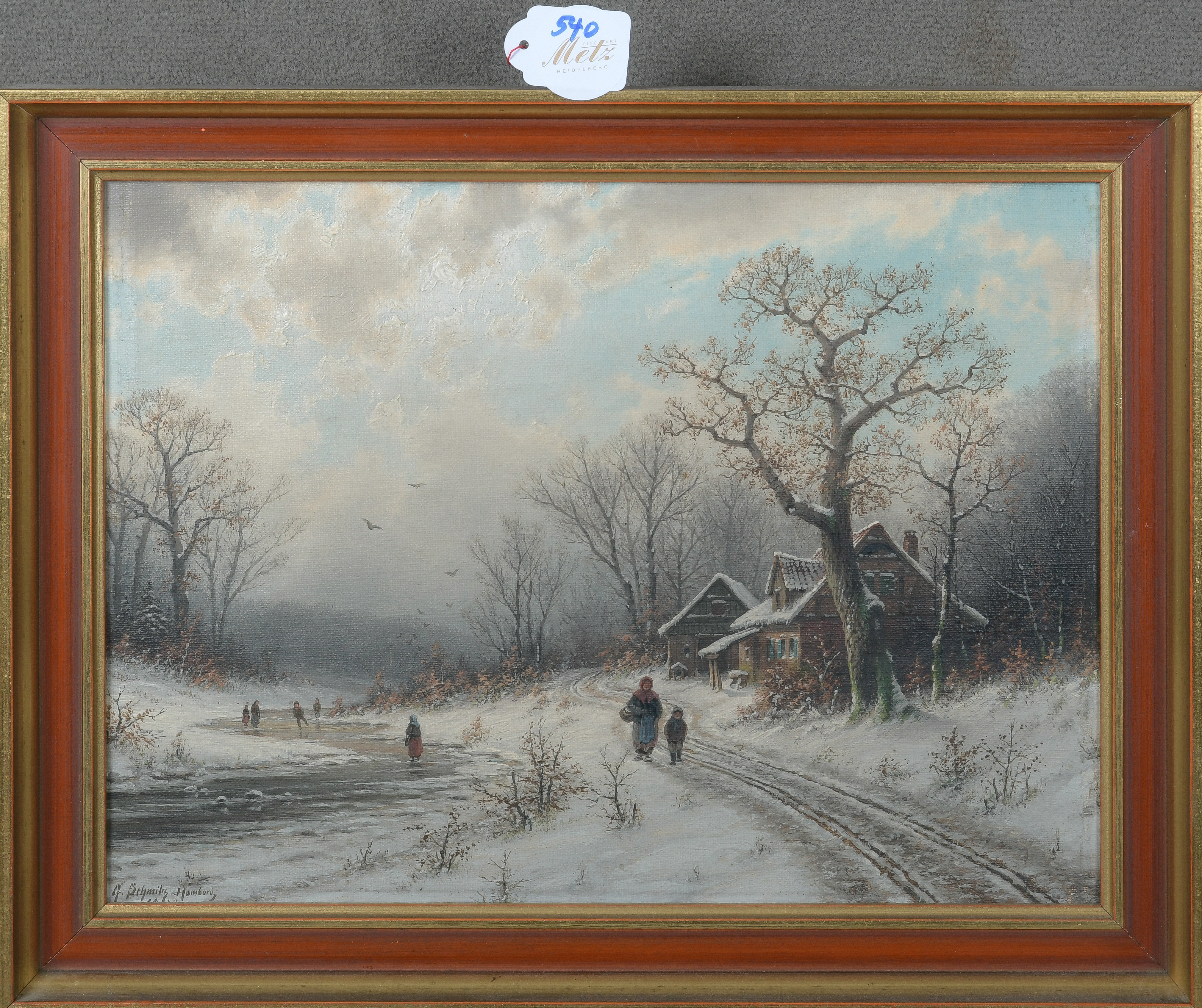 - Katalog-Nr: 540Georg Schmitz (1851-1917). Winterlandschaft mit Personenstaffage und Gebäude. Öl/Lw., li./u./sign./bez. „Hamburg“, gerahmt, 24,5 x 32,5 cm.o.L.