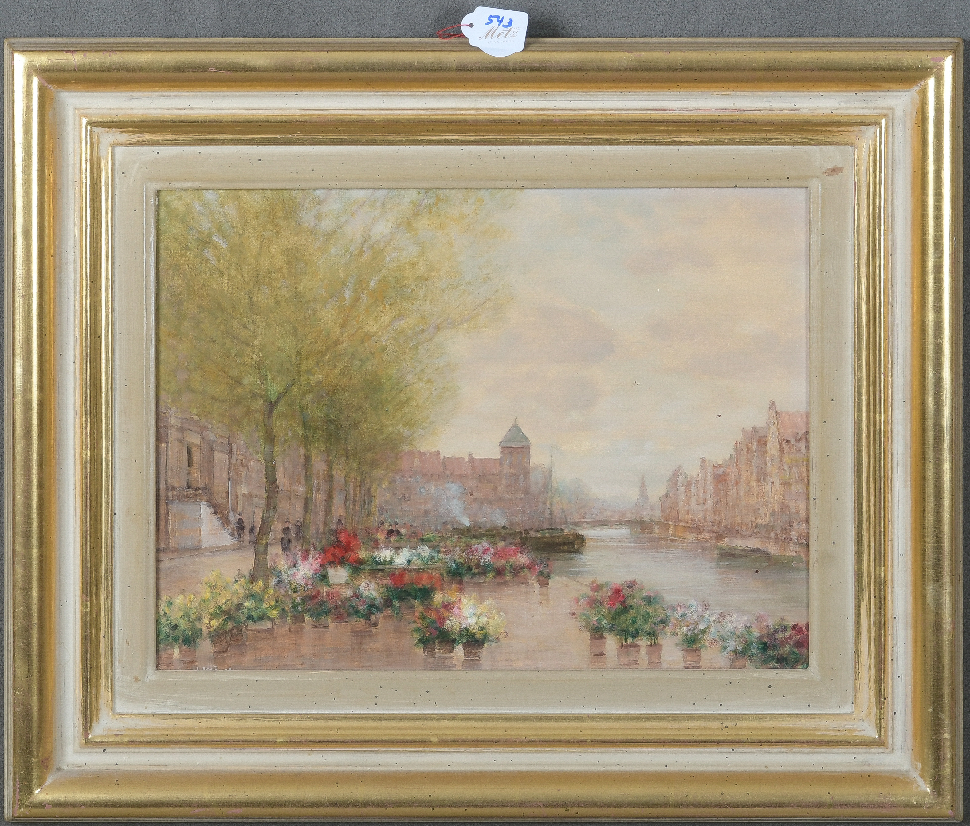 - Katalog-Nr: 543Anton Kaiser (*1928). Blumenmarkt, wohl in Amsterdam. Öl/Lw., li./u./sign., gerahmt, 30 x 40 cm.o.L.
