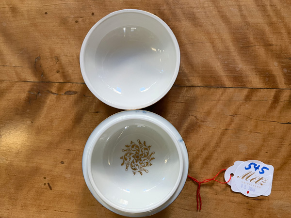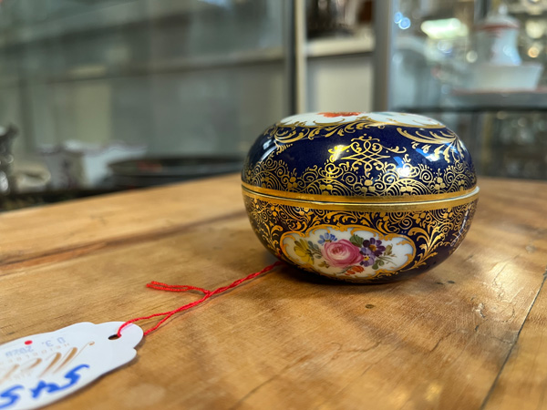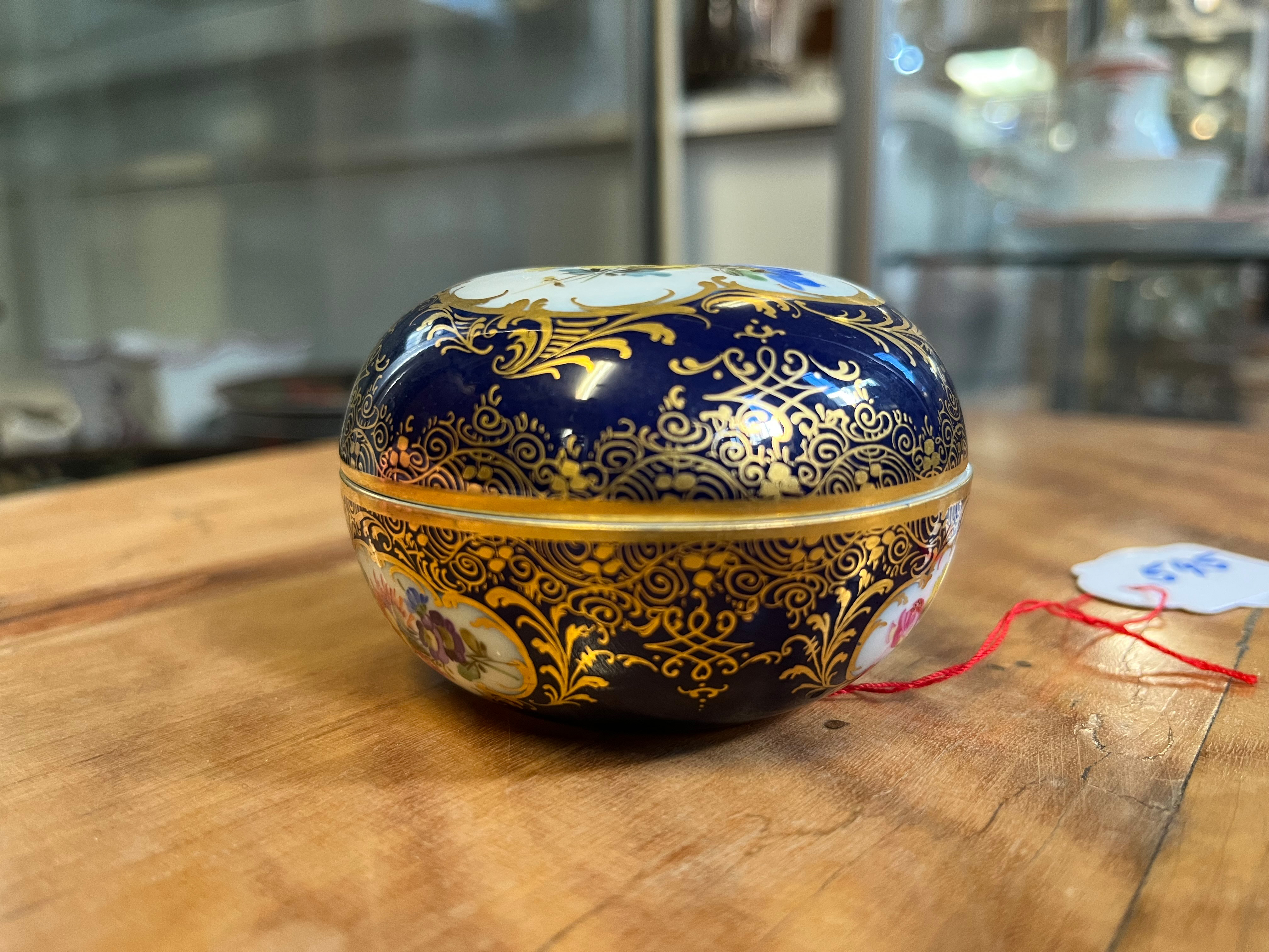 - Katalog-Nr: 545Runde Deckeldose. Meissen 19. Jh. Kobaltblauer Fond mit Goldspitzenbordüre und -kartusche. Reserve bunt bemalt mit Floraldekor. Porzellan, am Boden unterglasurblaue Schwertermarke, H=5,1 cm, D=7,5 cm.o.L.