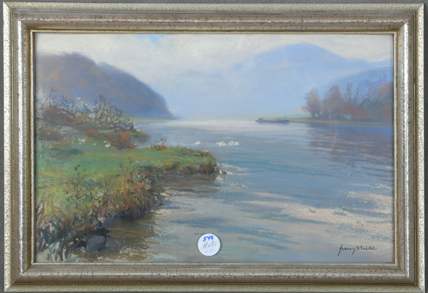 - Katalog-Nr: 544Franz Huth (1876-1970). „Aufsteigender Morgennebel über dem Neckar“. Pastell/Velin, re./u./sign., hi./Gl. gerahmt, 31 x 48 cm. Gutachten von Dr. phil. Benno Lehmann, Mannheim 2. Mai 2003, mit Zeitwertangabe über EUR 3.000,00 bis 3.500,00 liegt vor.o.L.