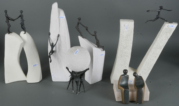 - Katalog-Nr: 550Luise Kött-Gärtner (*1953). Sechs Plastiken: „Trautes Paar“, „Gemeinsam sind wir stark“, „Wer nichts wagt“, „Zu zweit gehts“, „Die Hand reichen“ und „Sicherheit“. Bronze, auf Steinguss, H=12 bis 35 cm. Rechnung von ars mundi, Hannover 03.02.2005, über EUR 775,80 liegt vor.o.L.