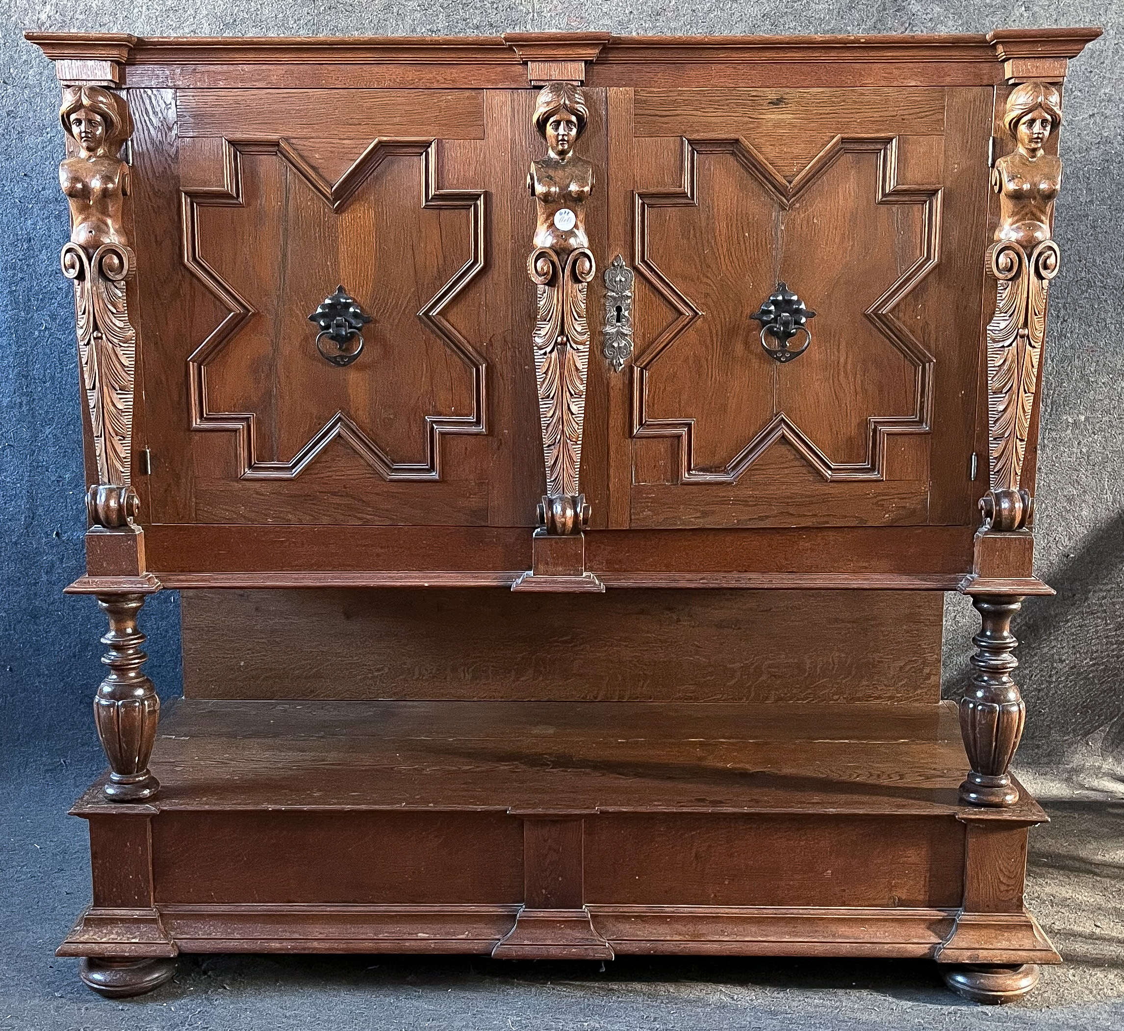 - Katalog-Nr: 677Historismus-Stollenschrank. Deutsch um 1900. Massiv Eiche / Nussbaum, auf vier plattgedrückten Füßen stehend, verkröpfte und profilierte Sockel und Gesims, zwei gedrechselte Säulen mit Rückwand, darauf zweitürige Front mit Karyatiden, die Türen sind profiliert und haben schmiedeeiserne Beschläge, H=147 cm, B=159 cm, T=62 cm. >>> Diese Los Nr. kann am Fr., den 10.04.26 (10.00 h bis 12.00 h) in unserem Depot in Mannheim abgeholt werden.o.L.