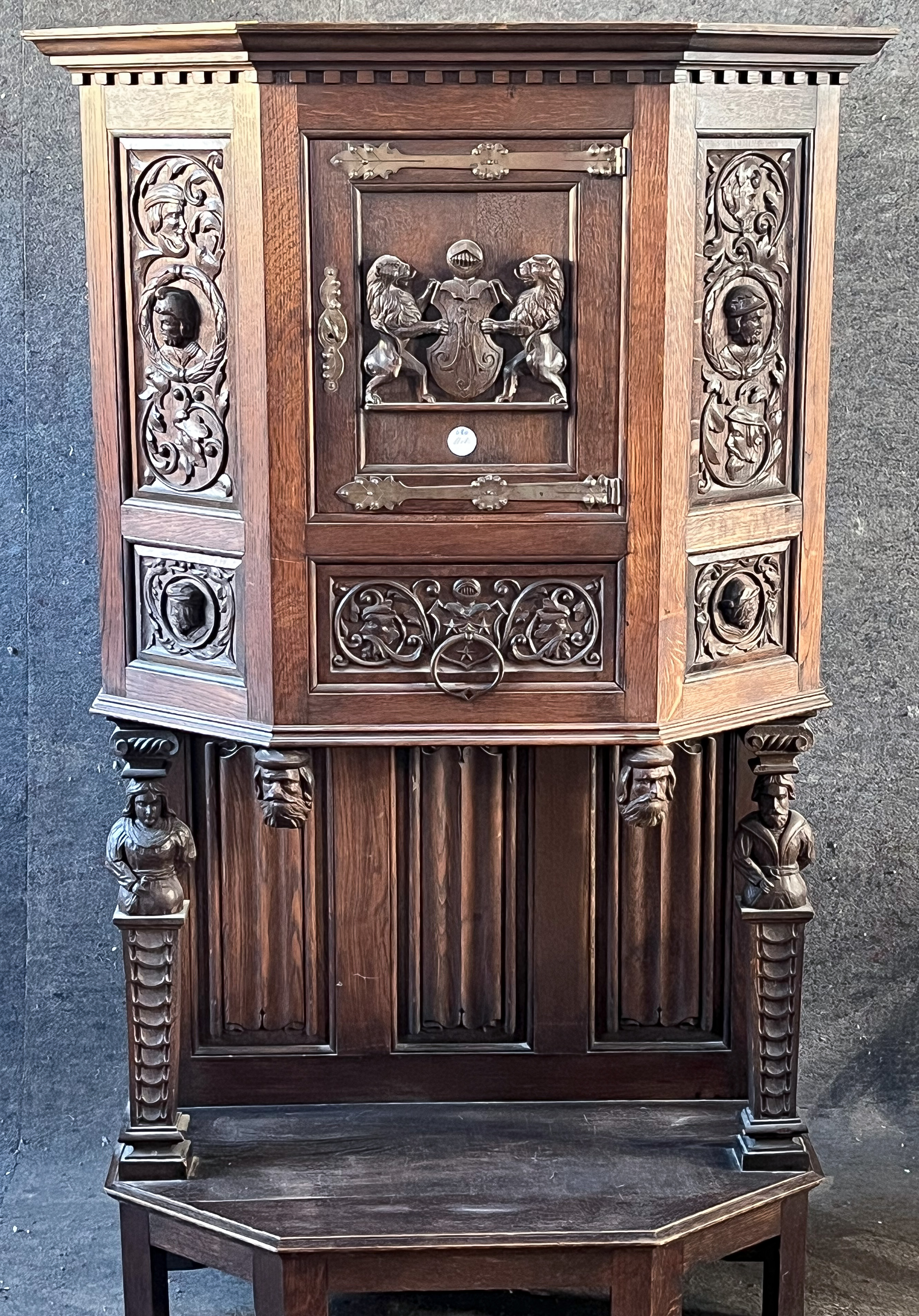 - Katalog-Nr: 680Historismus-Stollenschrank. Deutsch um 1900. Massiv Eiche, aufwendig geschnitzt mit Maskaronen, Karyatiden, Rocaillen, Blüten, Scheibenmuster und zwei Löwen mit Wappen, auf sechs Klotzfüßen stehend, Mittelplatte, Rückwand mit Faltwerk, einschübige Front, darüber eintürig, profilierter Abschlusssims mit Zahnschnitt, schmiedeeiserne Beschläge, H=159 cm, B=96 cm, T=48 cm. >>> Diese Los Nr. kann am Fr., den 10.04.26 (10.00 h bis 12.00 h) in unserem Depot in Mannheim abgeholt werden.o.L.