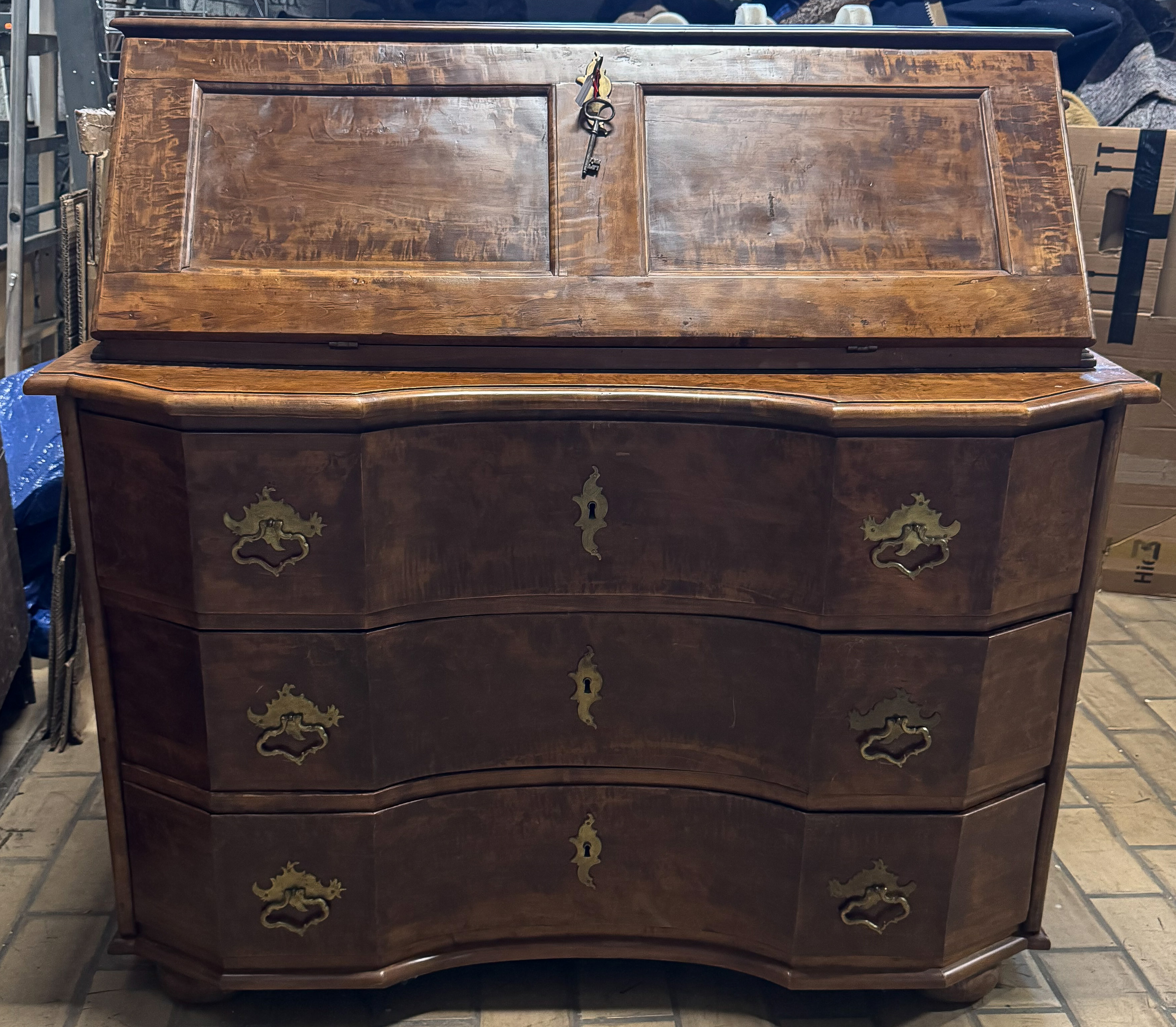 - Katalog-Nr: 688Schreibkommode. Deutsch 18./19. Jh. Massiv Birnbaum; Kugelfüße, dreischübig, abgeschrägte Kanten, mittig gebogen, gerade Seiten auf Füllung, zurückgesetzte Schreibklappe mit Inneneinteilung, profilierte Deckplatte, H=115 cm, B=122 cm, T=64 cm. >>> Diese Los Nr. kann am Fr., den 10.04.26 (10.00 h bis 12.00 h) in unserem Depot in Mannheim abgeholt werden.o.L.