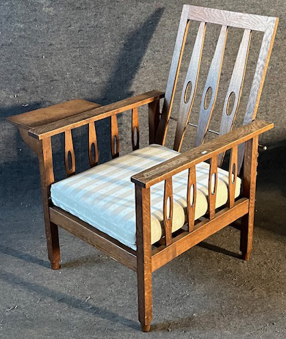- Katalog-Nr: 689Multifunktionsstuhl. Wohl Bauhaus 1930er Jahre. Massiv Eiche, verstellbare Rückenlehne, auf der rechten Seite eine ausklappbare Ablage, Rücken und Seiten durchbrochen. >>> Diese Los Nr. kann am Fr., den 10.04.26 (10.00 h bis 12.00 h) in unserem Depot in Mannheim abgeholt werden.o.L.