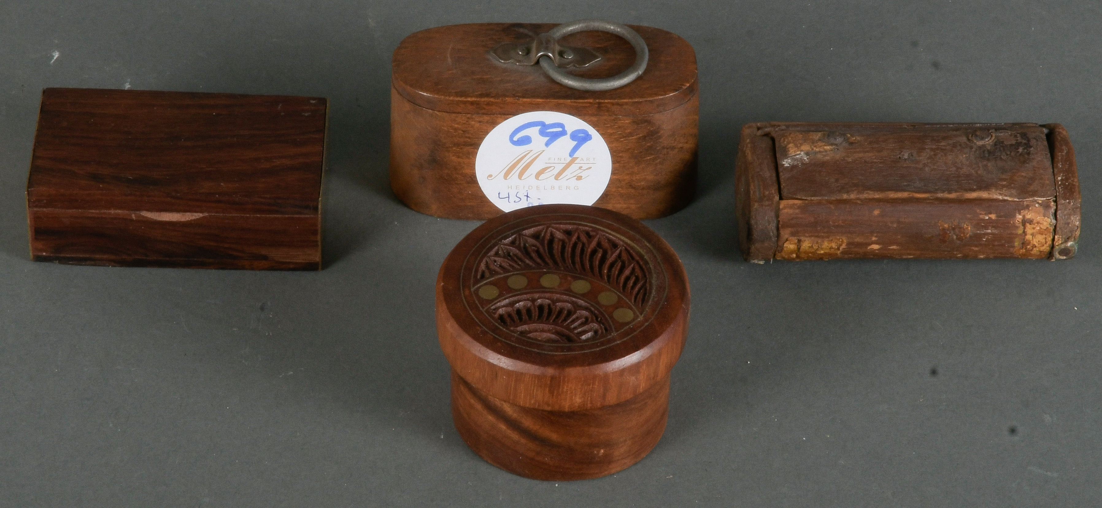 - Katalog-Nr: 699Vier kleine Holzdosen. England 19. Jh. und später. H=2,2 cm, B=6,8 cm, T=2,8 cm bis H=3,6 cm, B=5,2 cm, T=3,7 cm.o.L.