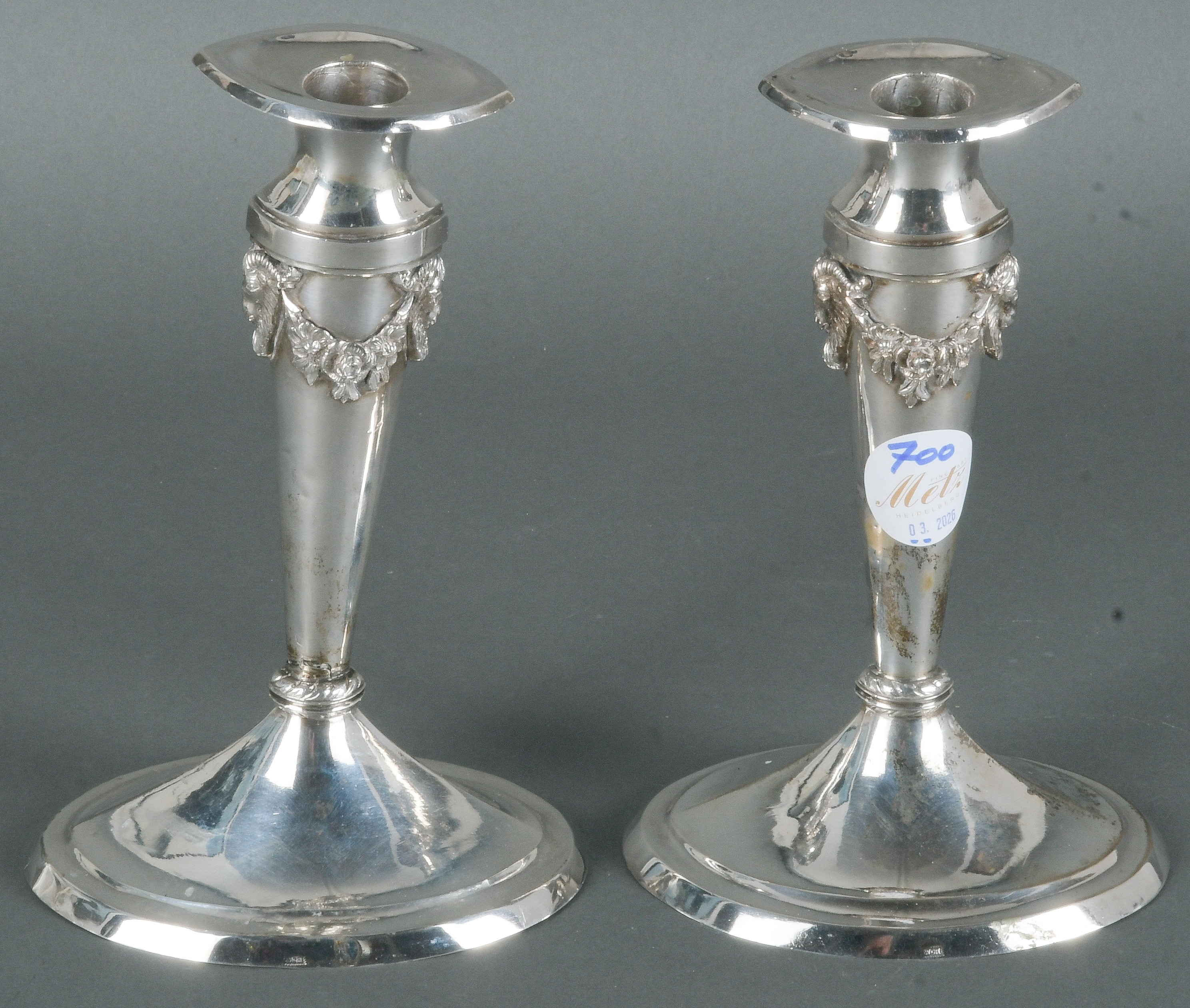 - Katalog-Nr: 700Paar Leuchter. Potsdam um 1780-85. 13-lötiges Silber, ca. 440 g, seitlich gepunzt, mit Meistermonogramm „WCH“, H=19,7 cm. (Schaft angebrochen)o.L.
