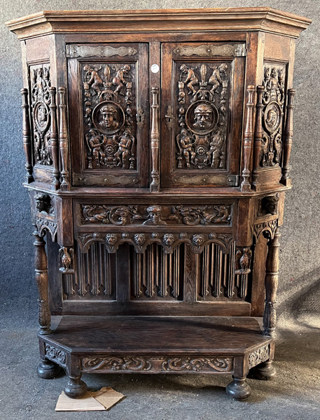 - Katalog-Nr: 679Historismus-Stollenschrank. Deutsch um 1900. Massiv Eiche, aufwendig geschnitzt mit Maskaronen, Fratze, Rocaillen, Vasen und Blüten, an den Seiten befindet sich Faltwerk, auf vier teilweise verzierten Klotzsäulen stehend, Mittelbrett, darüber ein Schub, eintürige Front und Seiten in Füllung gearbeitet, profiliertes Abschlussgesims, schmiedeeiserne Beschläge, H=150 cm, B=107 cm, T=49 cm. >>> Diese Los Nr. kann am Fr., den 10.04.26 (10.00 h bis 12.00 h) in unserem Depot in Mannheim abgeholt werden.o.L.