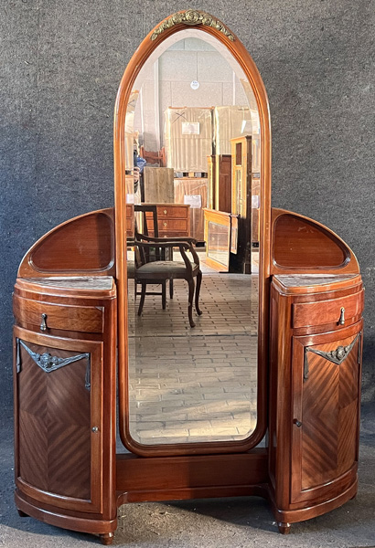 - Katalog-Nr: 681Art Déco-Spiegelkommode. Frankreich 20. Jh. Massiv Mahagoni, teilw. furniert, Metallbeschläge mit hängenden Tüchern und Blüten; gedrehte Füße, halbrunde Seiten, zurückgesetzter Spiegel mit Spitzgiebel, über den zwei halbrunden Türen befindet sich jeweils eine Schublade, über der aufgelegten Marmorplatte befinden sich halbkreisförmige, profilierte Stützen, H=187 cm, B=130 cm, T=30 cm. >>> Diese Los Nr. kann am Fr., den 10.04.26 (10.00 h bis 12.00 h) in unserem Depot in Mannheim abgeholt werden.o.L.