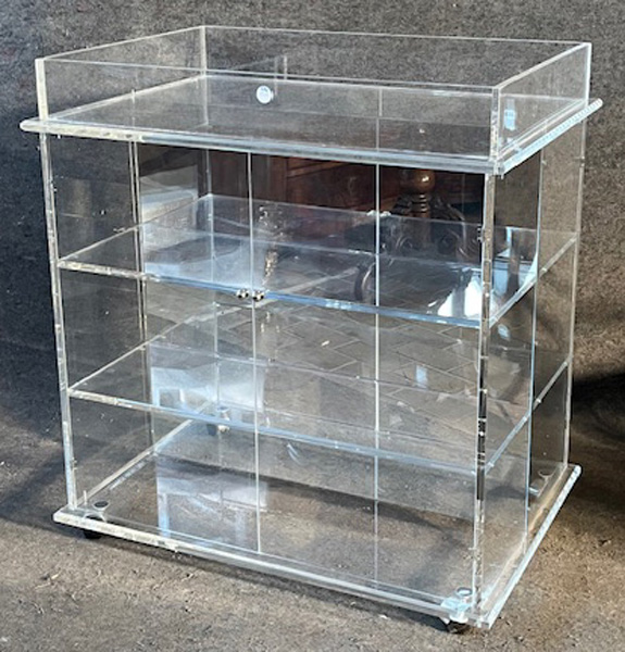 - Katalog-Nr: 686Rollvitrine. Deutsch 20. Jh. Plexiglas, auf vier Rollfüßen stehend, mit vier Türen und sechs Fächern, in der Mitte verspiegelt, H=108 cm, B=100 cm, T=70 cm. >>> Diese Los Nr. kann am Fr., den 10.04.26 (10.00 h bis 12.00 h) in unserem Depot in Mannheim abgeholt werden.o.L.