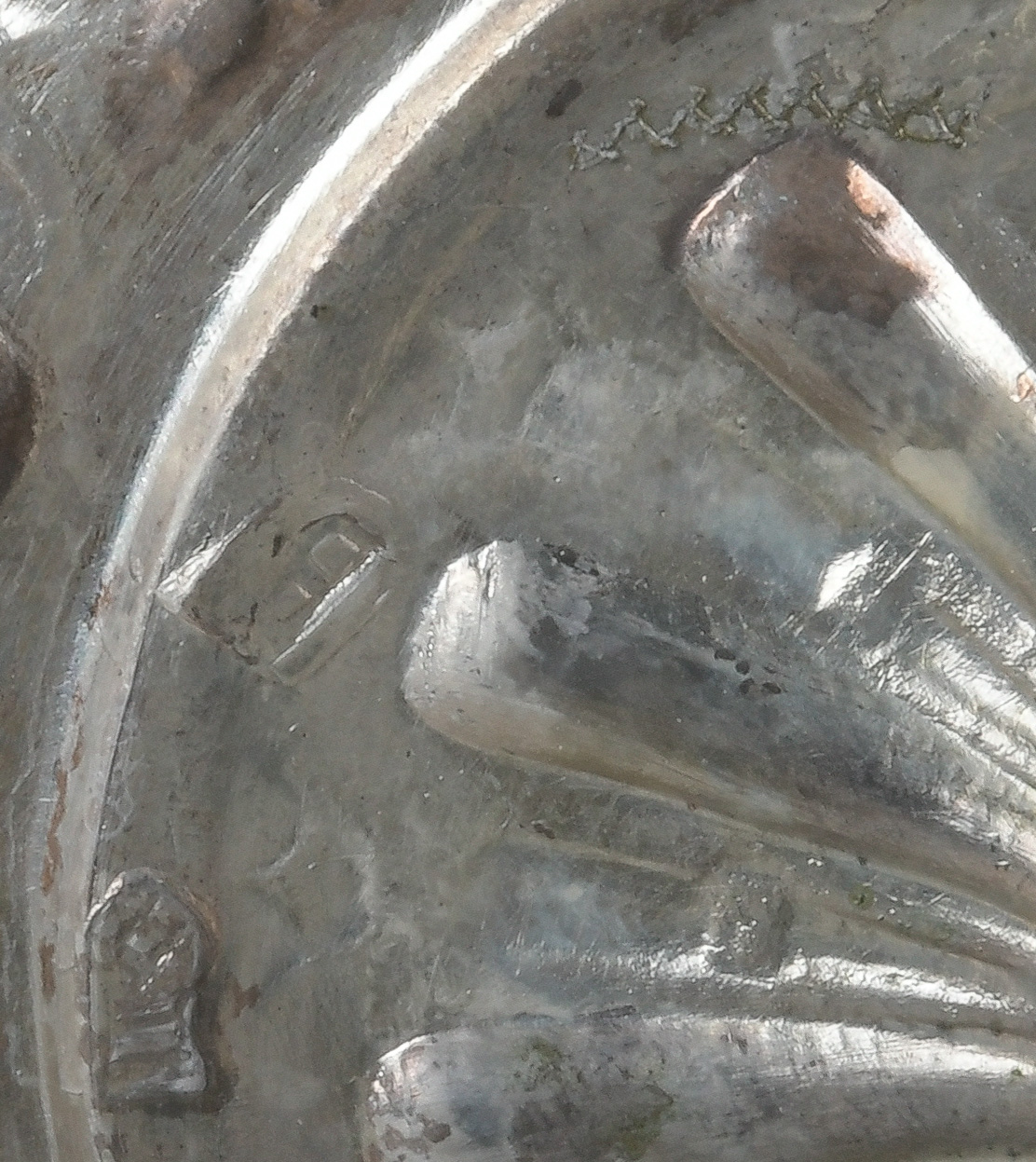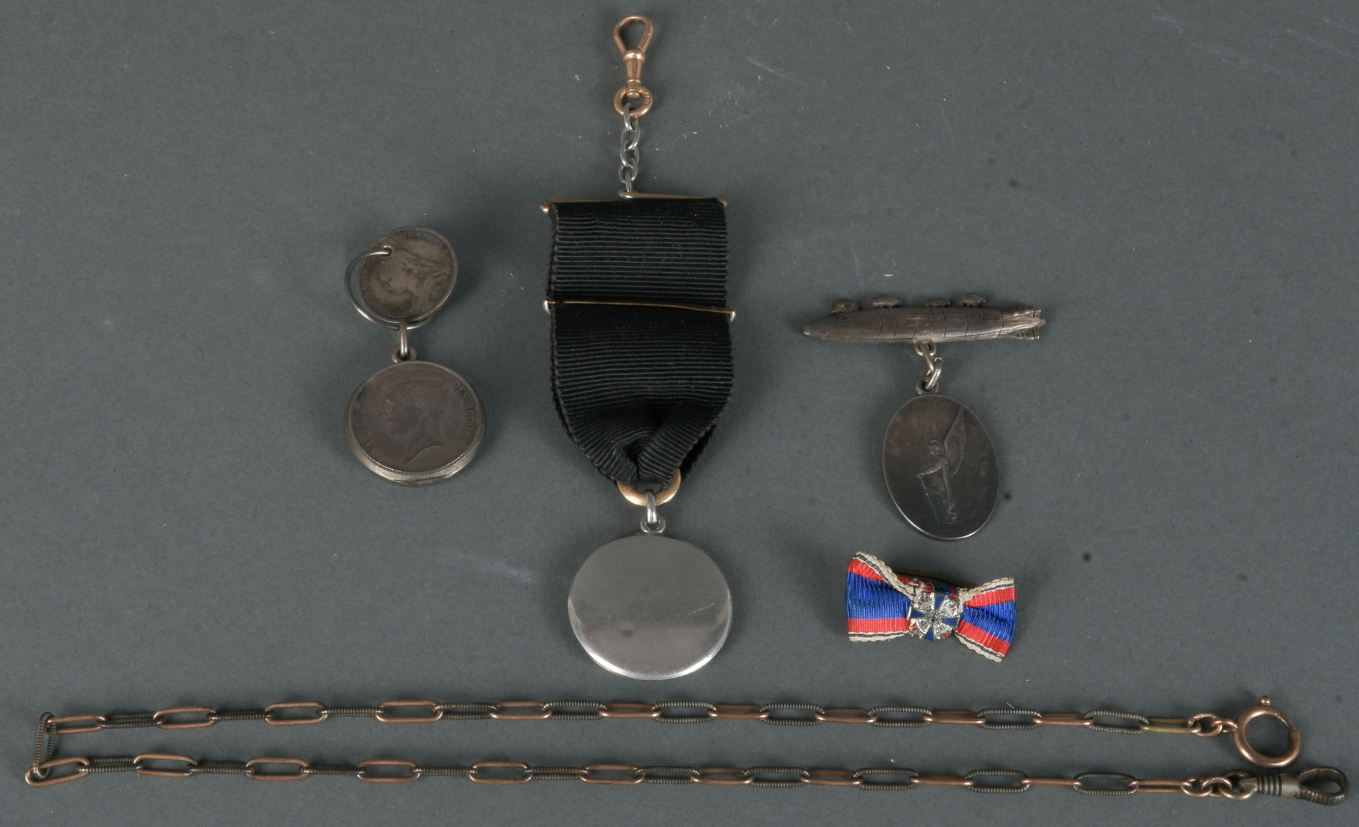 - Katalog-Nr: 753Miniatur-Ehrenkreuz, Zeppelinanhänger mit Plakette „Gott schütze Dich“, belgischer Münzanhänger, ein Bierzipfel (ungraviert) und Gliederkette.o.L.