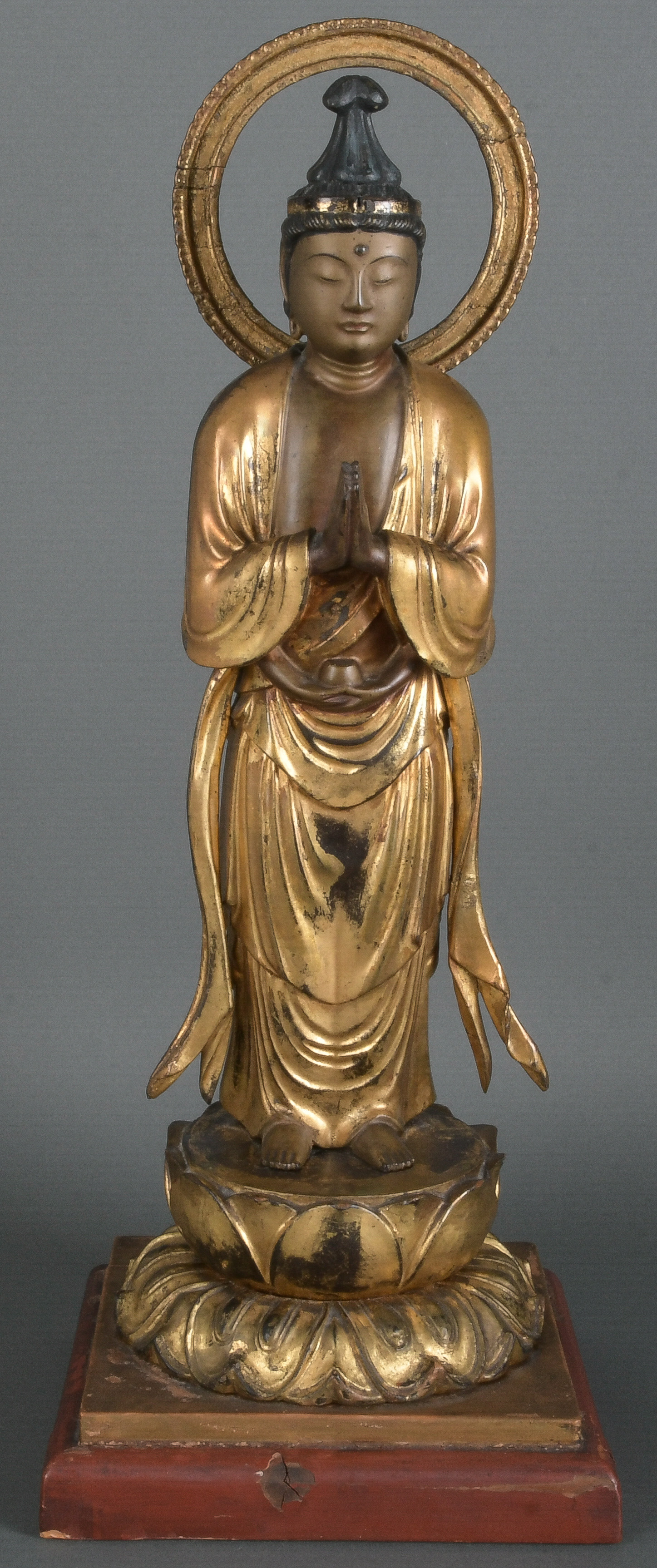 - Katalog-Nr: 770Amida Nyorai. Japan, Edo-Epoche 18. Jh. oder früher. Massivholz, geschnitzt, auf Kreidegrund gold gefasst, H=44,5 cm / mit Sockel: 48,5 cm.o.L.