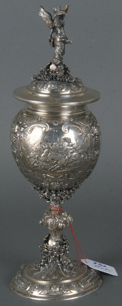 - Katalog-Nr: 751Deckelpokal. Hanau um 1900. Silber (geprüft), ca. 476 g, ungepunzt, H=27,4 cm. (min. besch.)o.L.