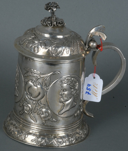 - Katalog-Nr: 754Deckelhumpen. Wohl Augsburg, Meister Anton Fischer. Silber, ca. 525 g, innen vermeilt, mit Stadt- und Meistermarke, H=17,8 cm.o.L.