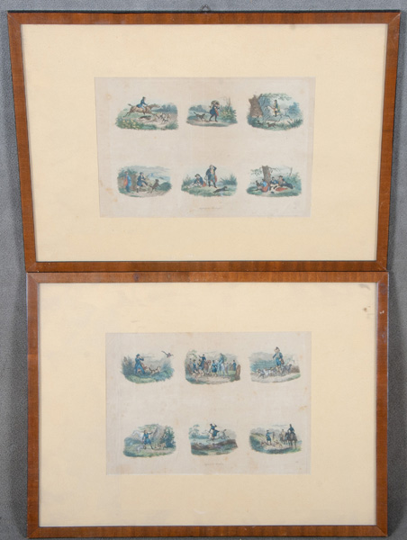 - Katalog-Nr: 758Graphiker des 19. Jhs. Konvolut Jagddarstellungen. Zwölf colorierte Kupferstiche, zwei Passepartout hi./Gl. gerahmt, je 19 x 27 cm.o.L.