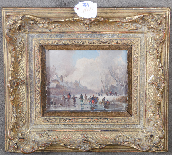 - Katalog-Nr: 764Adolf Stademann (1824-1895) attrib. Winterlandschaft mit Schlittschuhläufern. Öl/Holz, gerahmt, 12 x 15 cm.o.L.