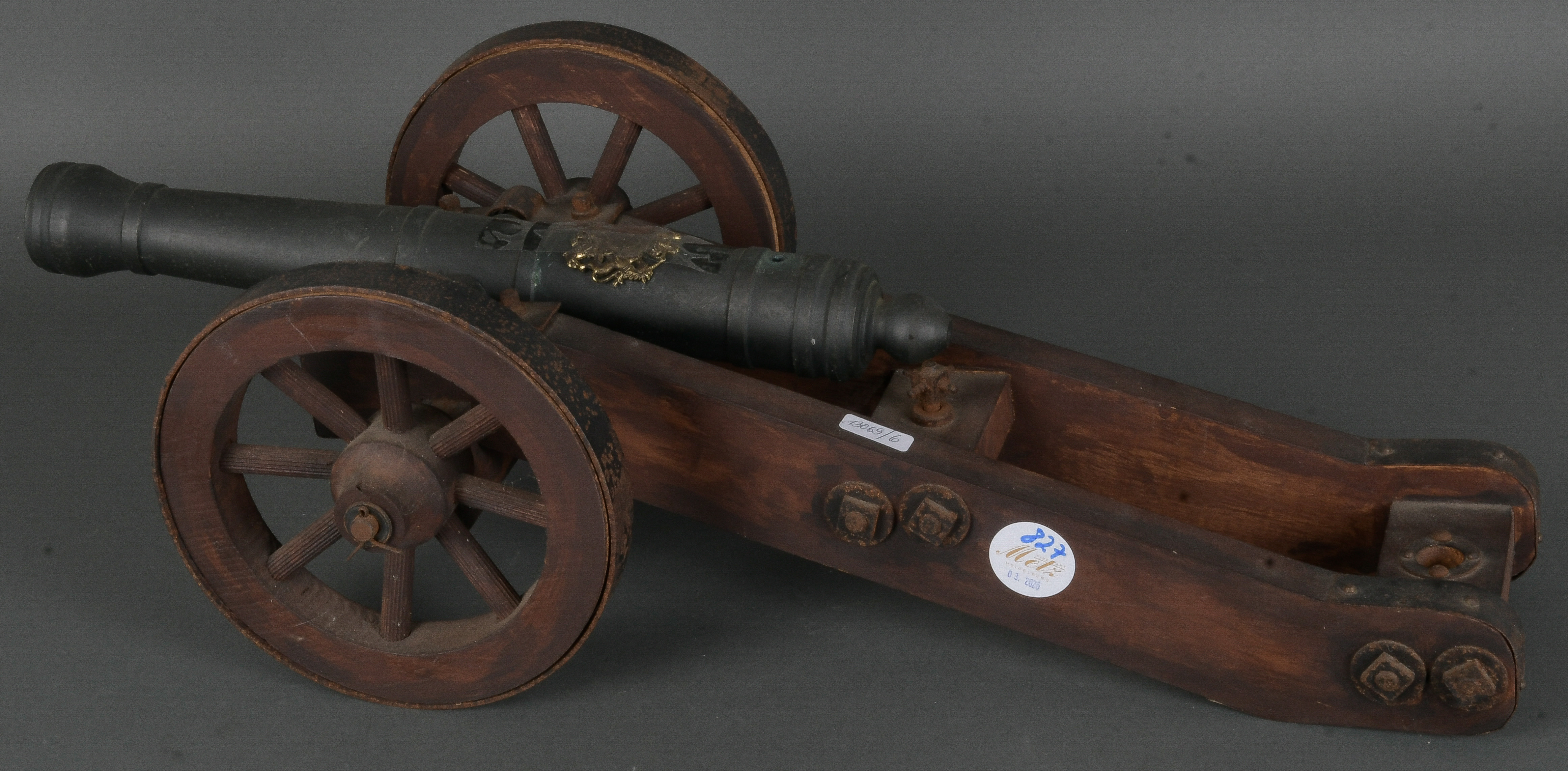 - Katalog-Nr: 827Tischkanone. Wohl deutsch 20. Jh. Massives Holzgestell mit beweglichem Rohr, H=17 cm, L=57 cm, B=23,5 cm.o.L.