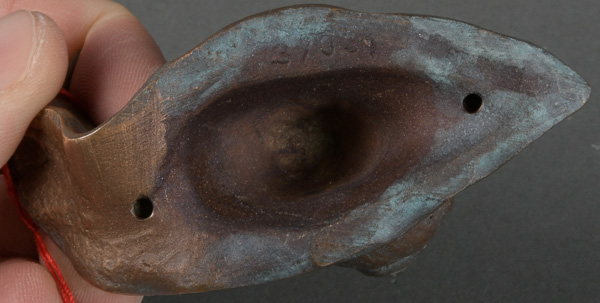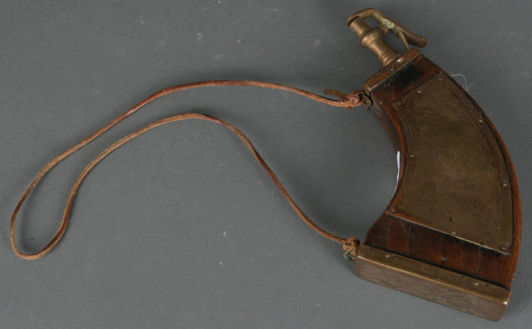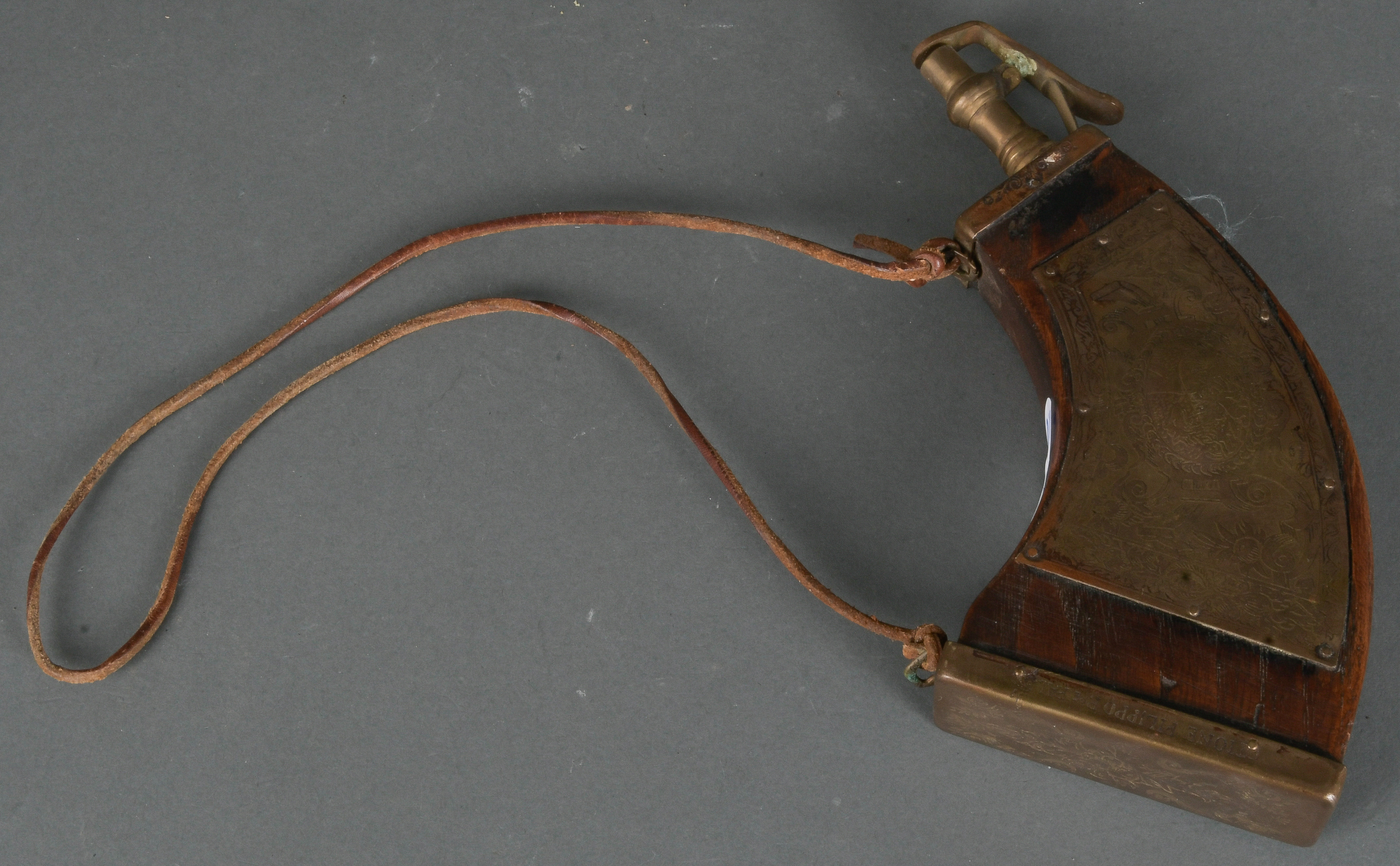 - Katalog-Nr: 829Pulverhorn. Wohl deutsch 18./19. Jh. Massivholz mit ziseliertem Messingbeschlag, H=8,5 cm, L=22 cm, B=3,2 cm.o.L.