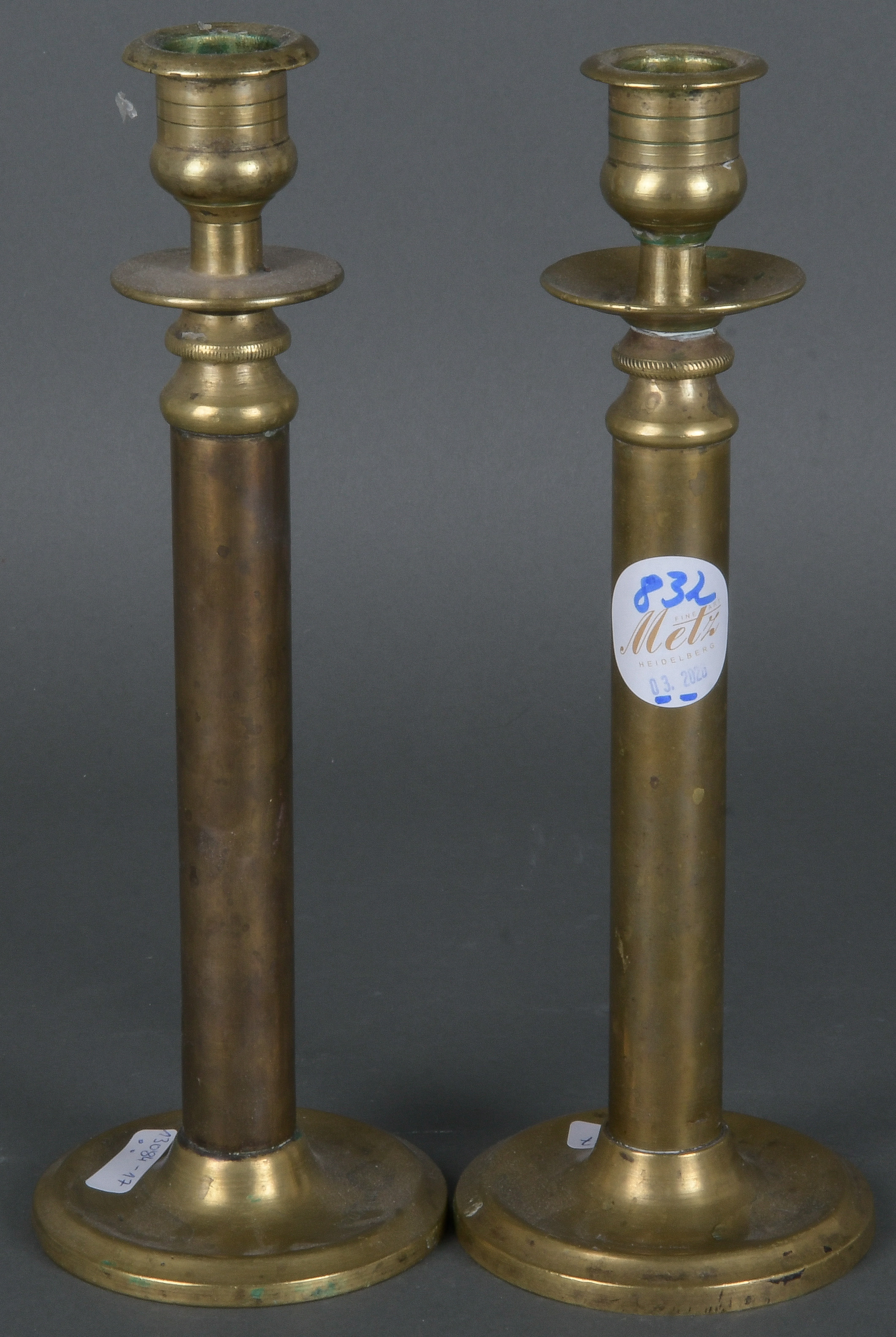- Katalog-Nr: 832Paar Leuchter. Deutsch um 1900. Messing, beschriftet „Weltpatent“, H=24 cm.o.L.