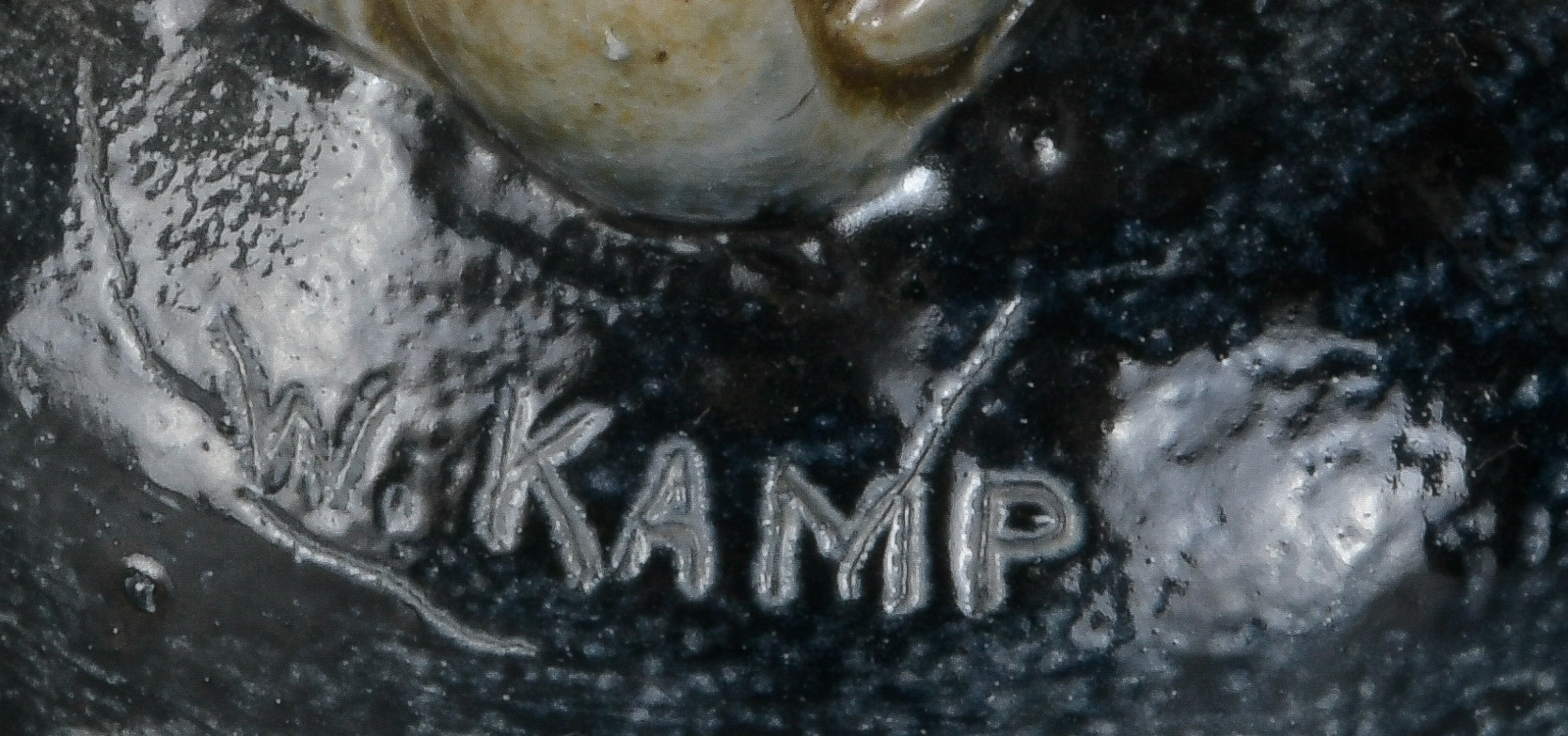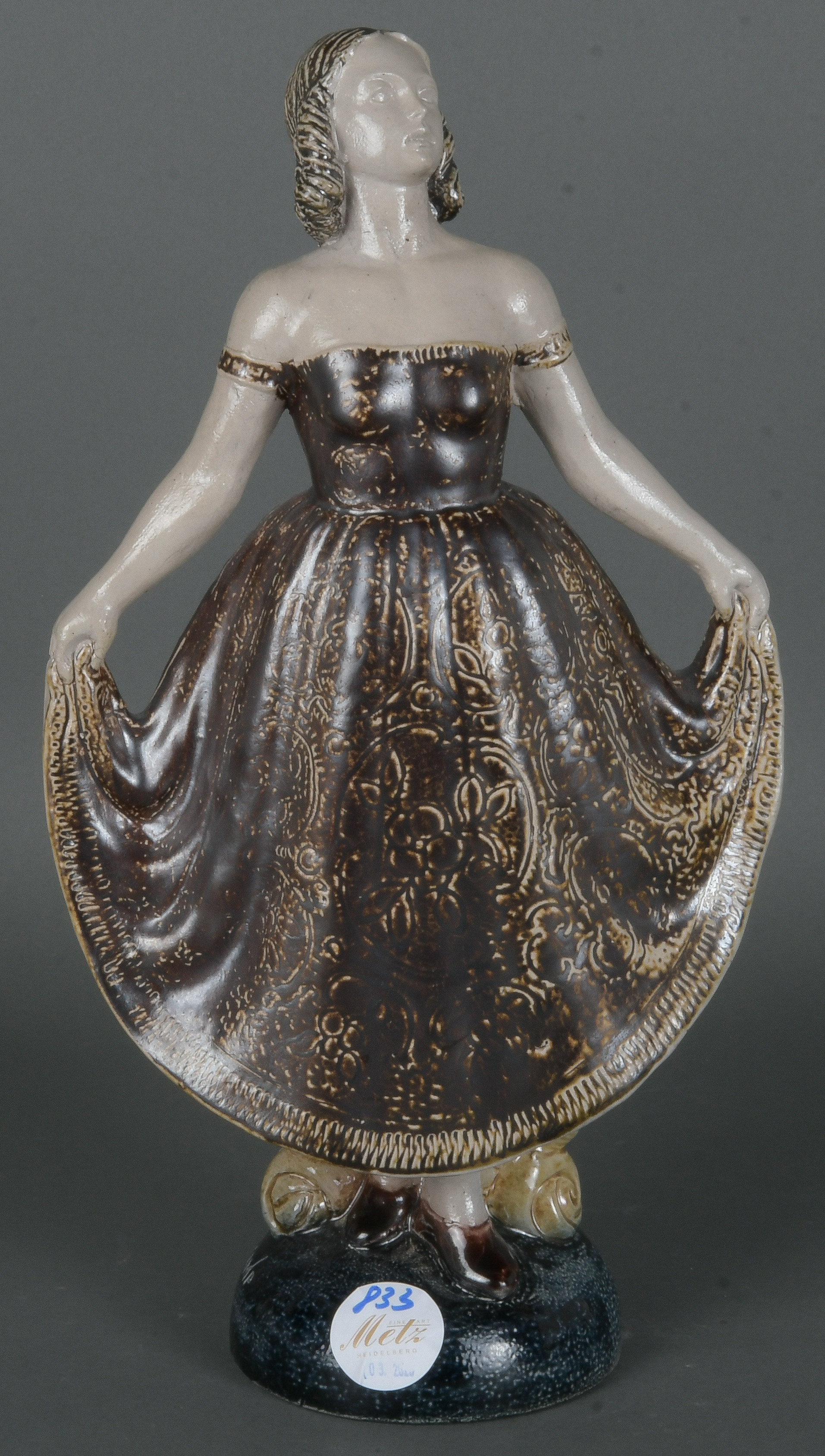 - Katalog-Nr: 833Tänzerin. Höhr-Grenzhausen 20. Jh. Salzglasiertes Steinzeug, am Boden gemarkt, Entwurf und sign. W.(ilhelm Anton) Kamp (1879-1951), H=36,5 cm.o.L.