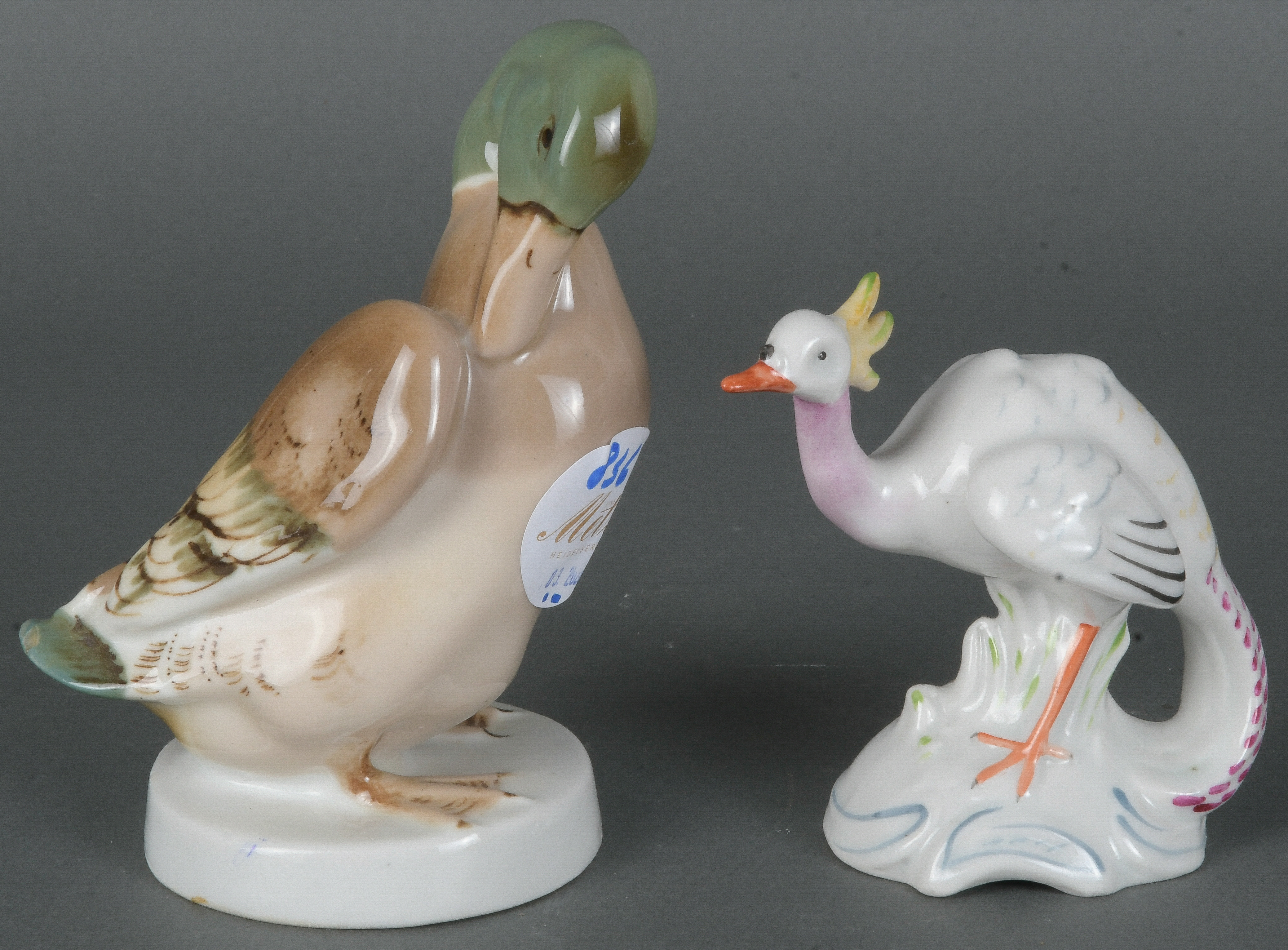 - Katalog-Nr: 836Wildente und Paradiesvogel. Deutsch 20. Jh. Porzellan, bunt bemalt, ohne Marke, H=8,8 / 12,4 cm.o.L.