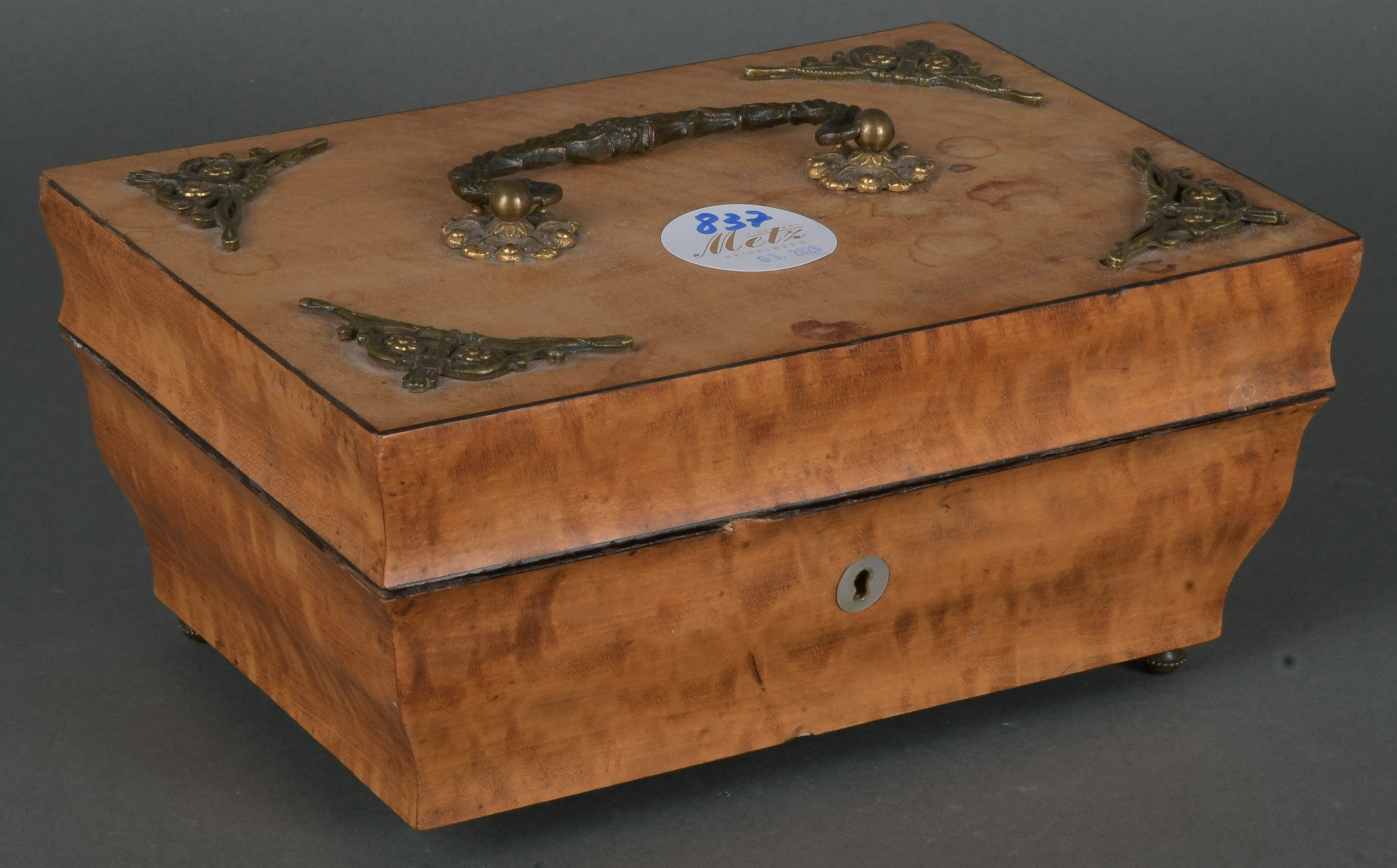 - Katalog-Nr: 837Rechteckige Schatulle. Deutsch 19. Jh. Birke, mit Bronzeapplikationen und -griff, H=8,5 cm, B=19 cm, T=13,5 cm. (ein Fuß und Schlüssel fehlen)o.L.