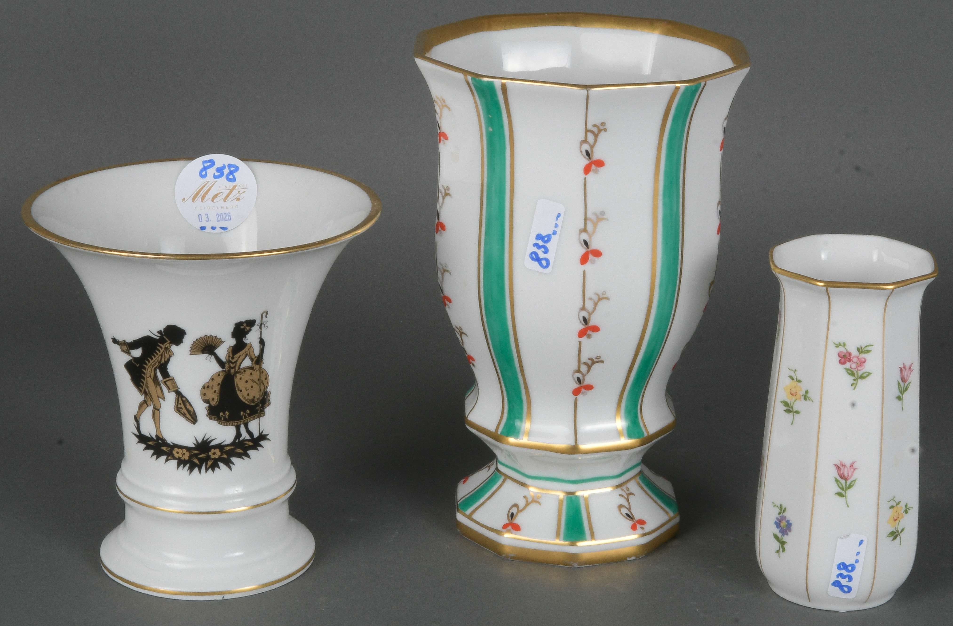 - Katalog-Nr: 838Drei Vasen. Fürstenberg 20. Jh. Porzellan, bunt bemalt und gold gesäumt; am Boden unterglasurblaue, bekrönte F-Marke, H=12,5 bis 18,5 cm.o.L.