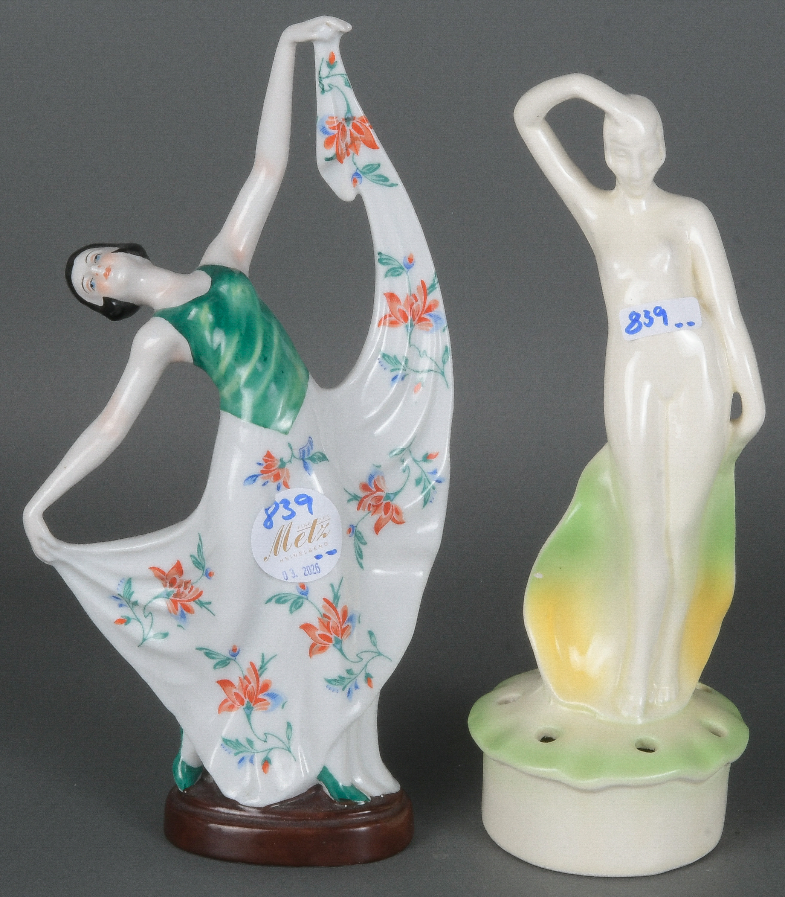 - Katalog-Nr: 839Zwei Art Déco-Figuren. Wohl Böhmen um 1920. Porzellan, bunt bemalt, ohne Marke, H=25 / 26,5 cm.o.L.