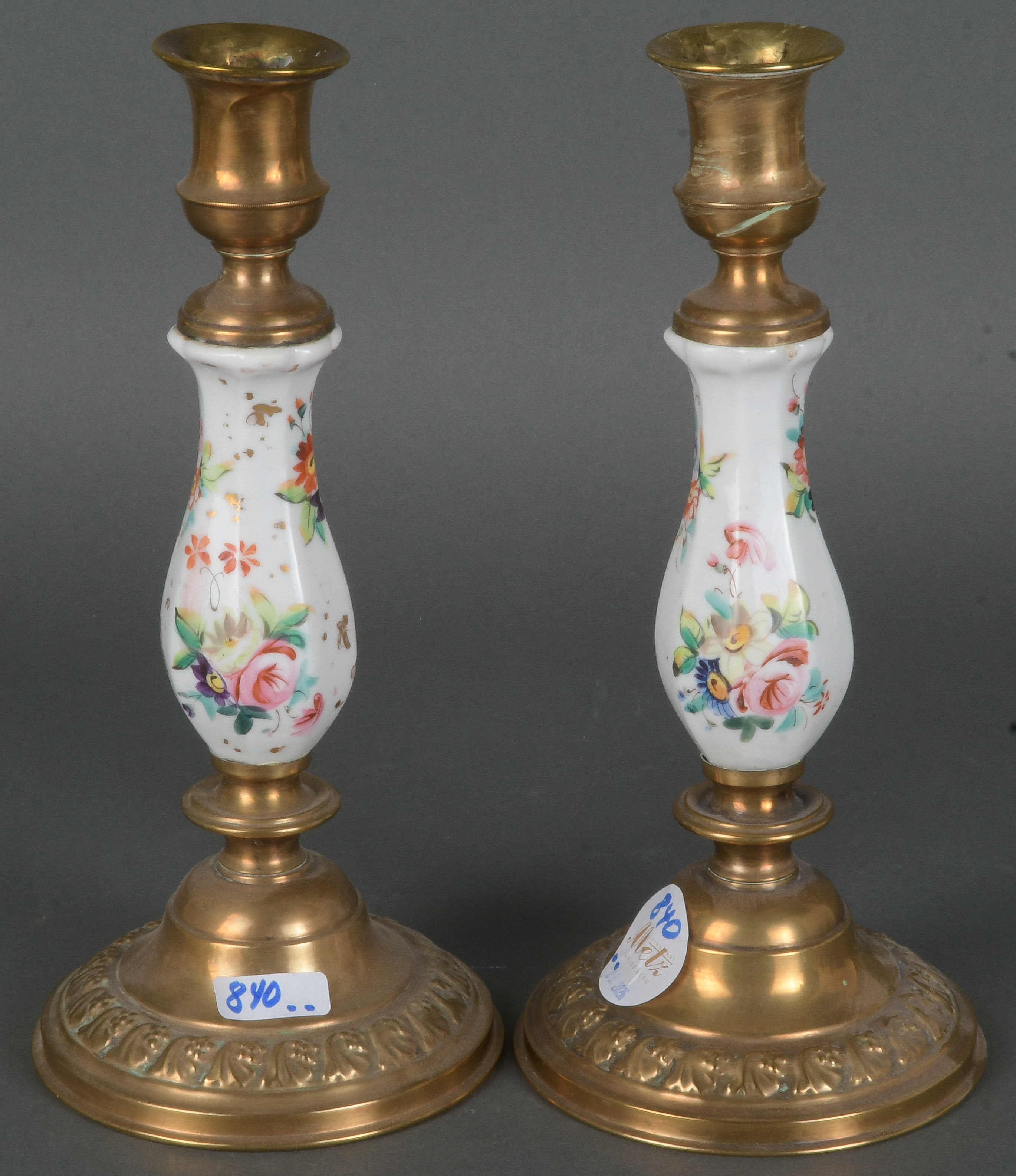 - Katalog-Nr: 840Paar Leuchter. Böhmen um 1900. Messing mit Porzellanschaft, bunt bemalt mit Floraldekor, H=23 cm.o.L.
