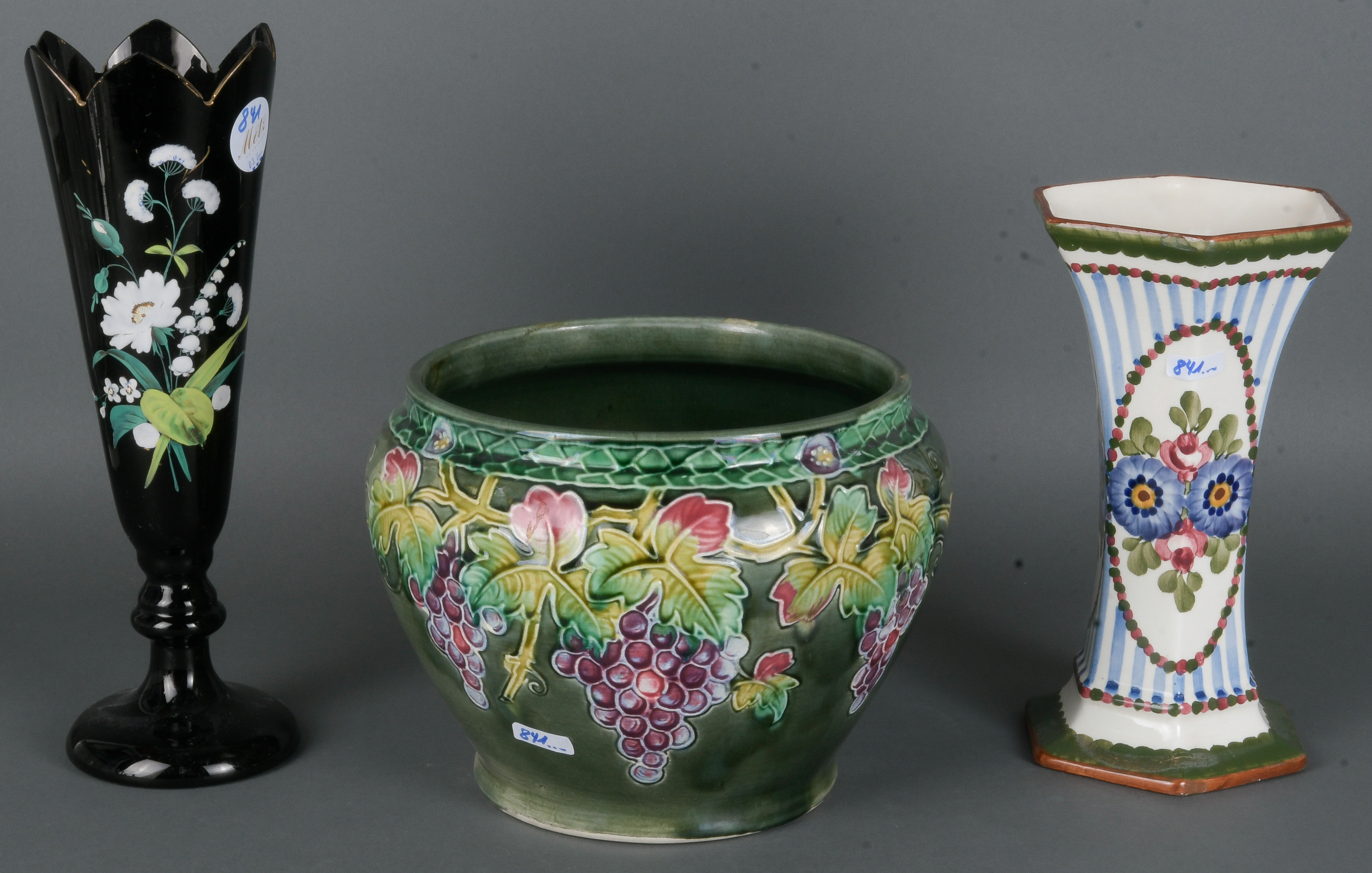 - Katalog-Nr: 841Drei unterschiedliche Vasen, u.a. Annaberg 20. Jh. Steinzeug / Glas, teilw. am Boden gemarkt, H=18 bis 30,5 cm.o.L.