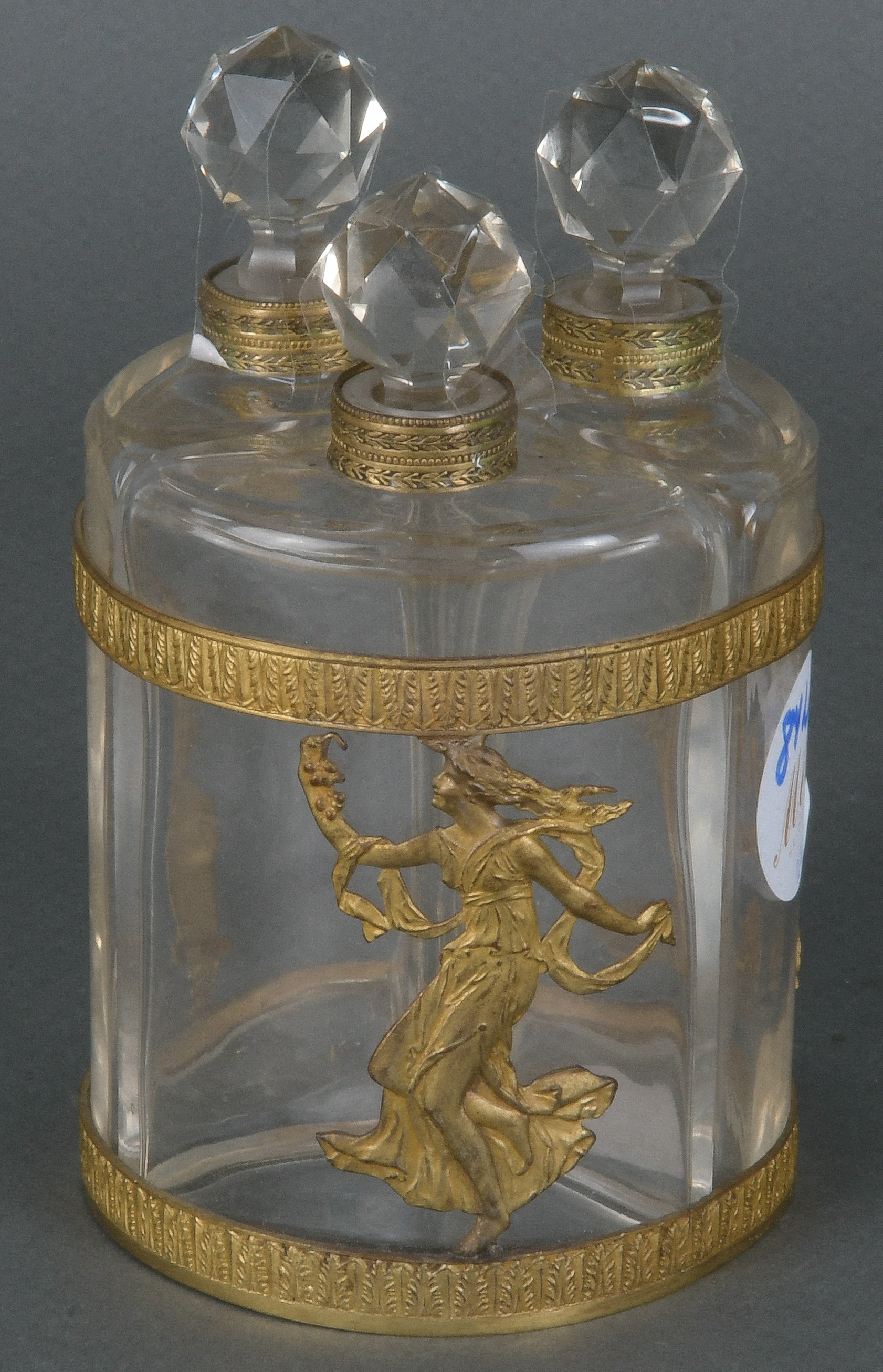- Katalog-Nr: 842Drei Flakons. Frankreich 19. Jh. Farbloses Glas, in vergoldeter Halterung, facettierte Stöpsel, H=14,5 cm.o.L.