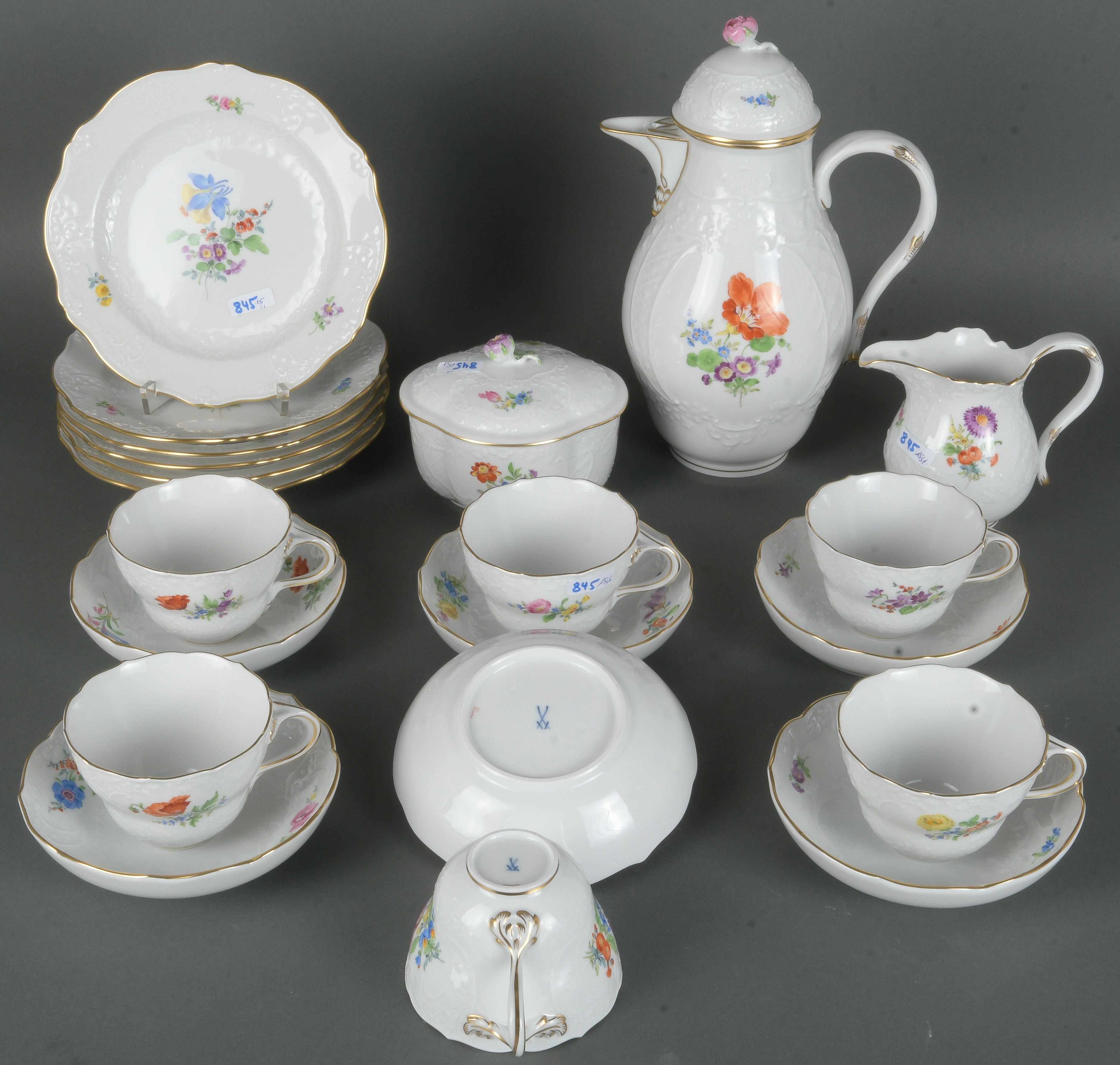 - Katalog-Nr: 84515-tlgs. Kaffeeservice „Ozierrelief“. Meissen 20. Jh. Porzellan, bunt bemalt mit Floraldekor, Goldrand; am Boden unterglasurblaue Schwertermarke. Bestehend aus: Eine Kaffeekanne (H=25,5 cm), ein Milchgießer (H=11,5 cm), eine Zuckerdose (H=9,5 cm), sechs Tassen mit Unterschalen und sechs Kuchenteller (D=je 18,8 cm).o.L.