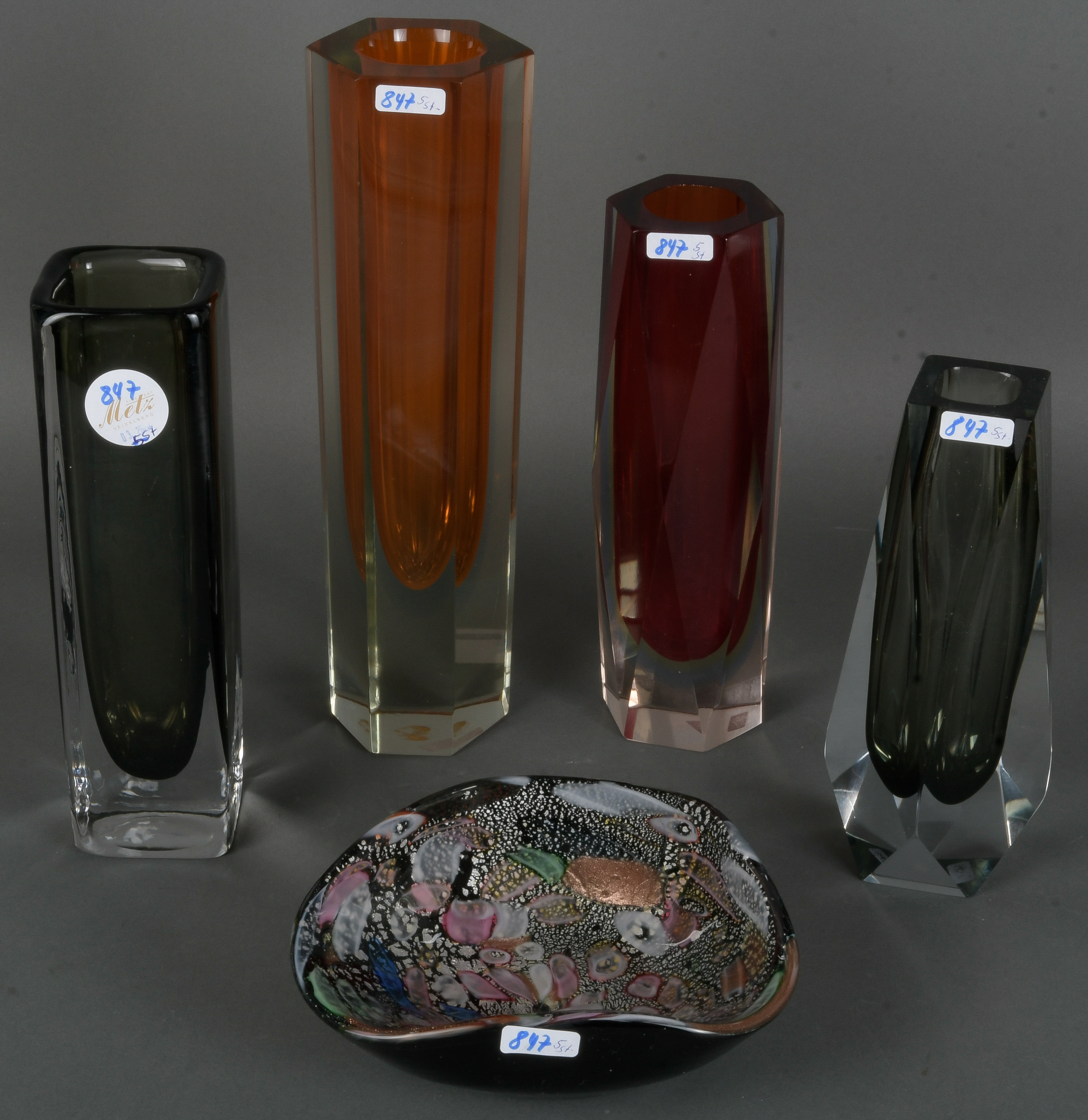 - Katalog-Nr: 847Fünftlgs. Konvolut u.a. Murano / Orrefors 20. Jh. Farbloses Glas mit farbigem Überfang bzw. Einschmelzungen. Bestehend aus: Vier Vasen (H=21 bis 30,5 cm) und eine Schale (H=6,5 cm, B=17 cm, T=18,5 cm).o.L.
