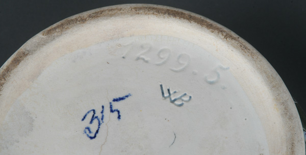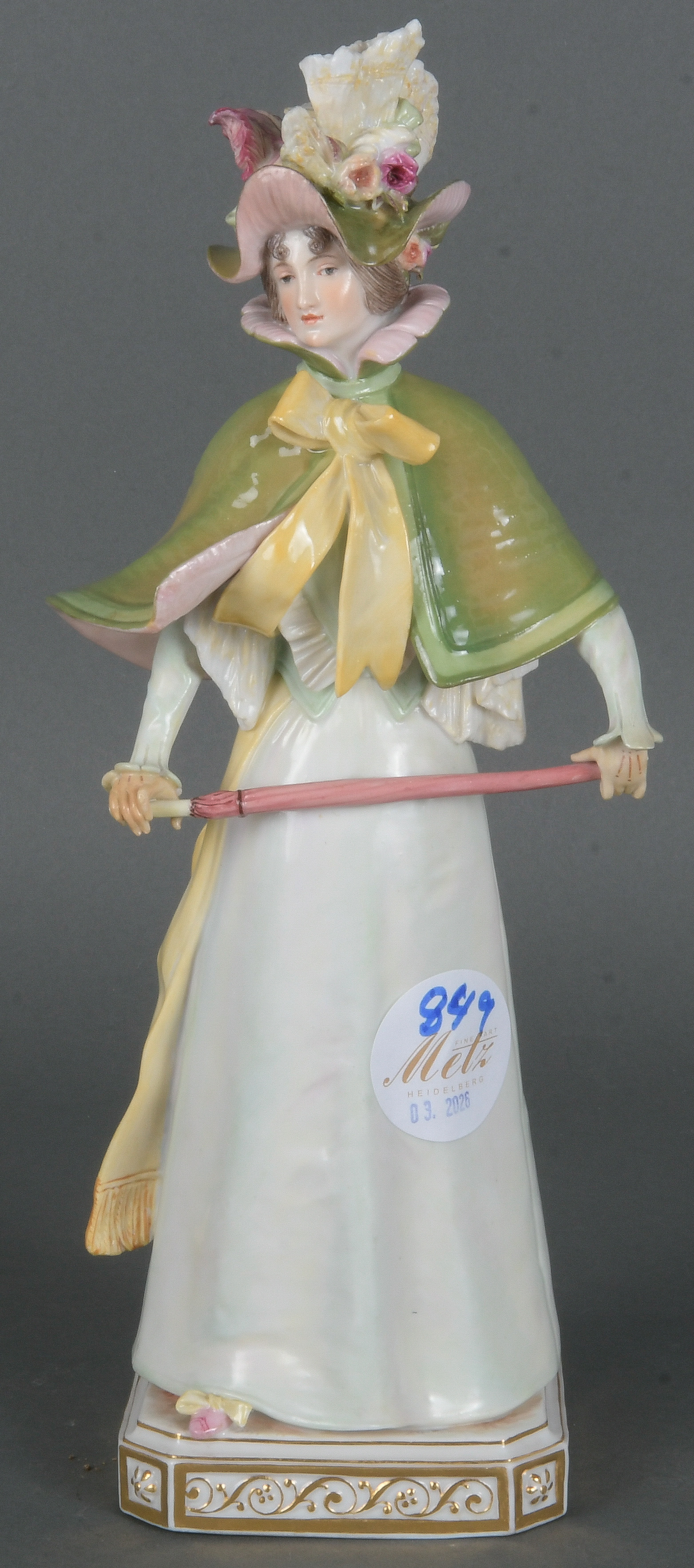 - Katalog-Nr: 849Dame mit Schirm. Meissen 1896. Stehend auf oktogonalem Reliefsockel, gold gesäumt. Porzellan, bunt bemalt, am Boden unterglasurblaue Schwertermarke, Formnummer „Q 128“, Staffiererziffer „33.“, Entwurf von Robert Schirmer, H=25,5 cm.o.L.