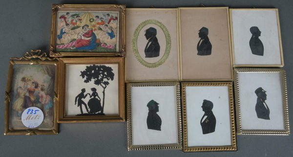 - Katalog-Nr: 835Neuntlgs. Konvolut Rahmen. Deutsch 20. Jh. Blech / Holz / Messing, teilw. verglast, mit Scherenschnitten bzw. Tuschfederzeichnungen, 7,5 x 8,2 bis 9,5 x 11,8 cm.o.L.