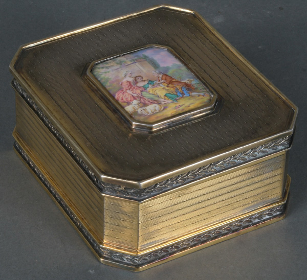 - Katalog-Nr: 843Deckeldose. Deutsch um 1900. 925er Sterlingsilber, Gesamtgewicht ca. 322 g, vergoldet und reich ziseliert, Deckel mit Emailplakette, bunt bemalt mit Watteauszene, Innenseite des Deckels verspiegelt, H=4,1 cm, B=8 cm, T=9,3 cm.o.L.