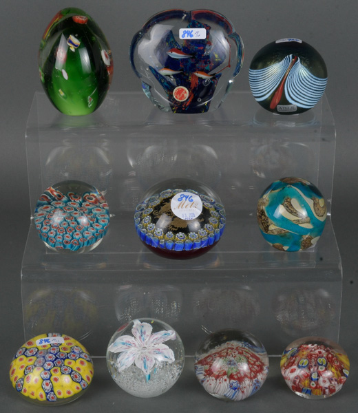 - Katalog-Nr: 846Zehn unterschiedliche Paperweights, u.a. Murano / Kosta Boda 20. Jh. Farbloses Glas mit farbigen Einschmelzungen, teilw. mit Original-Etikett bzw. Ätzsignatur, H=4,5 bis 10 cm.o.L.