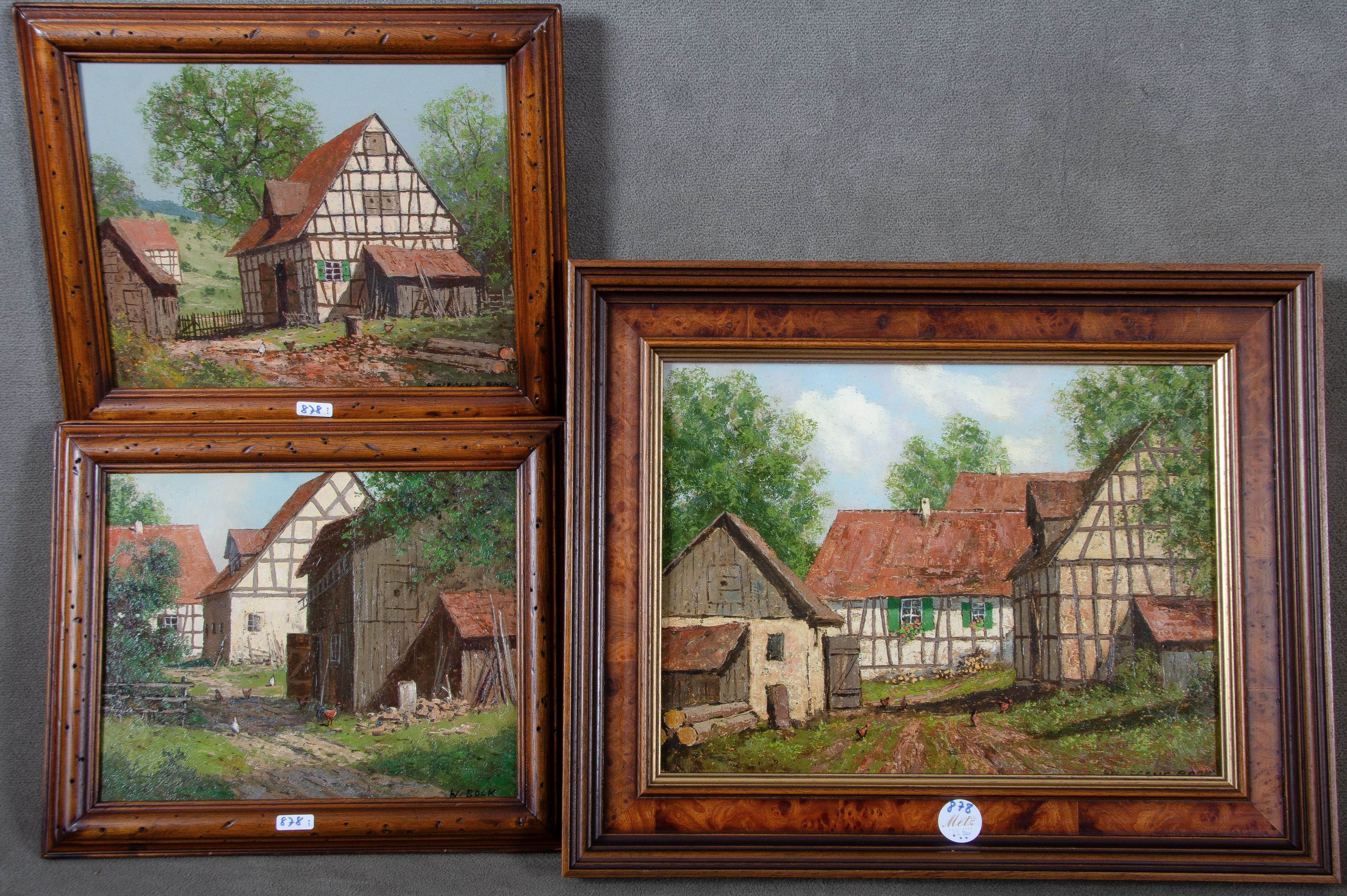 - Katalog-Nr: 878Wolfgang Bock (*1936). Drei Ansichten von Fachwerkgebäuden. Öl/Hartfaser, re./u./sign., gerahmt, 24,5 x 30 bis 30,5 x 40,5 cm.o.L.