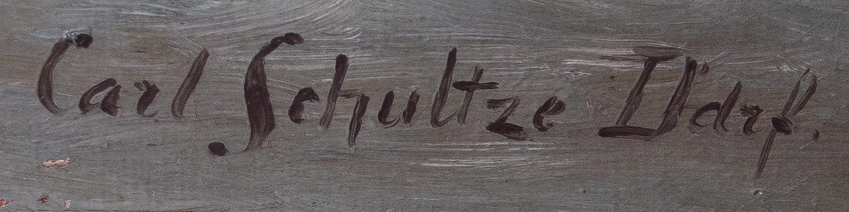 - Katalog-Nr: 889Karl Schultze (1856-1935). Gebirgslandschaft mit Wildbach und Mühle. Öl/Lw., re./u./sign./bez. „D(üssel)d(o)rf“, gerahmt, 89 x 126 cm.o.L.