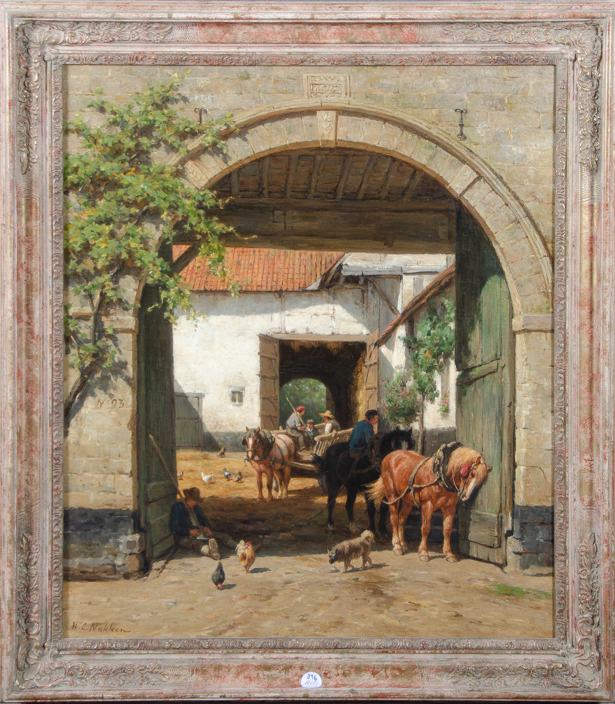 - Katalog-Nr: 896Wilhelm Karel Nakken (1835-1926). Vierkanthof mit Pferden, Federvieh und Hund. Öl/Lw., li./u./sign./dat. (18)93, gerahmt, 84 x 72 cm.o.L.