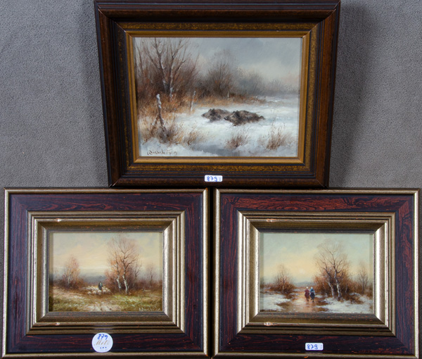 - Katalog-Nr: 879Hermann Wiesenhöfer (*1929). Zwei Winterlandschaften mit Schwarzwild bzw. Personenstaffage und eine Herbstlandschaft mit Schäfer und Herde. Drei Öl/Sperrholz, li. bzw. re./u./sign., gerahmt, 13 x 18 / 18 x 22,5 cm.o.L.