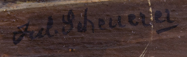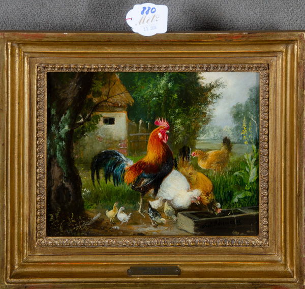 - Katalog-Nr: 880Julius Scheurer (1859-1913). Hahn mit Hennen und Küken an Futterschale in Gartenlandschaft. Öl/Lw., re./u./sign., gerahmt, 16 x 21 cm.o.L.