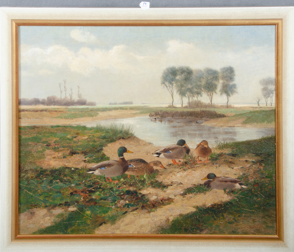 - Katalog-Nr: 891Viktor Pucinski (1882-1952). Uferlandschaft mit Enten und Bäumen. Öl/Lw., re./u./sign., gerahmt, 80 x 98 cm.o.L.