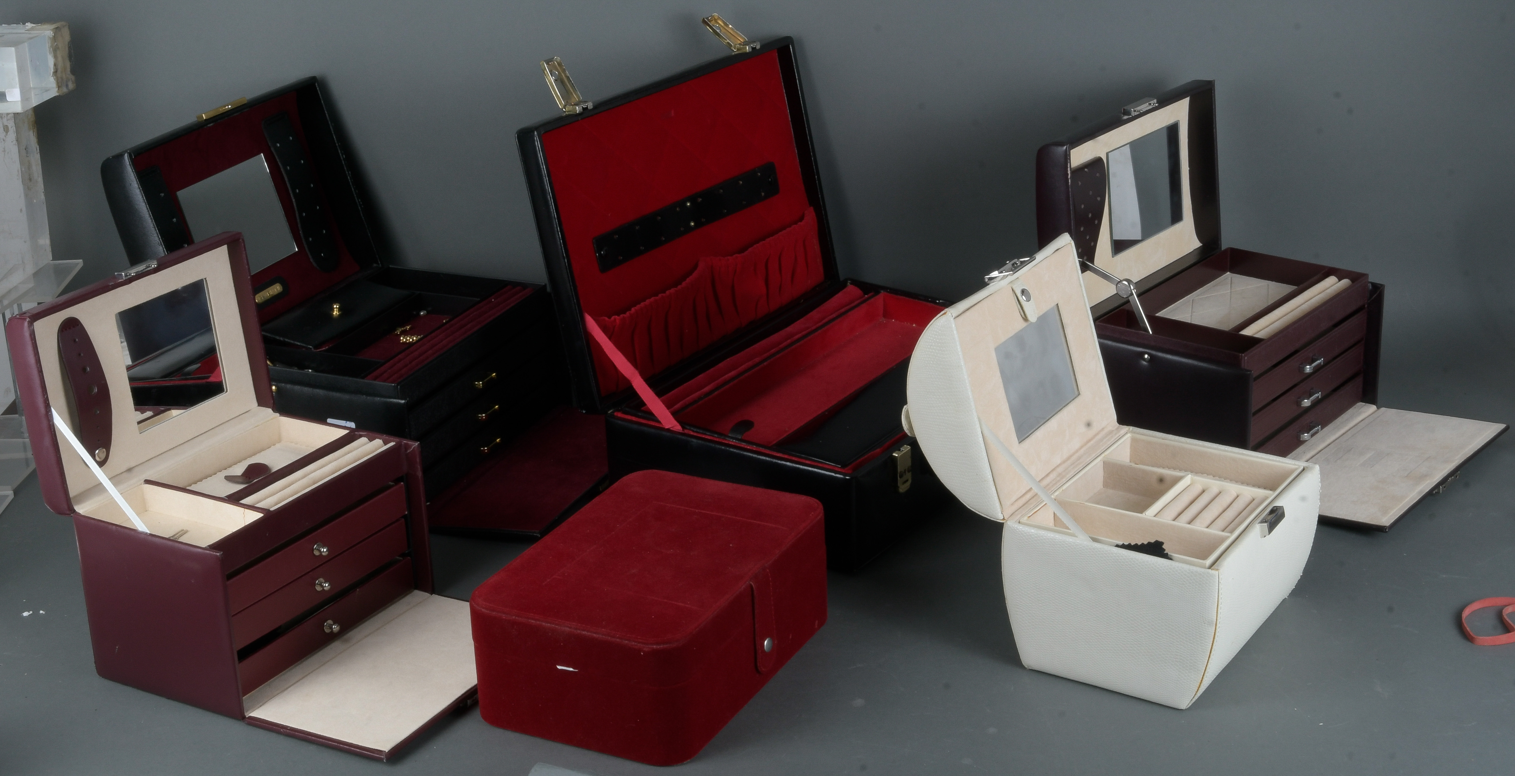 - Katalog-Nr: 1027Sechs unterschiedliche Schmuckschatullen, teilw. Samt / Leder, H=8,5 cm, B=23,5 cm, T=16 cm bis H=10,5 cm, B=35 cm, T=23 cm.o.L.