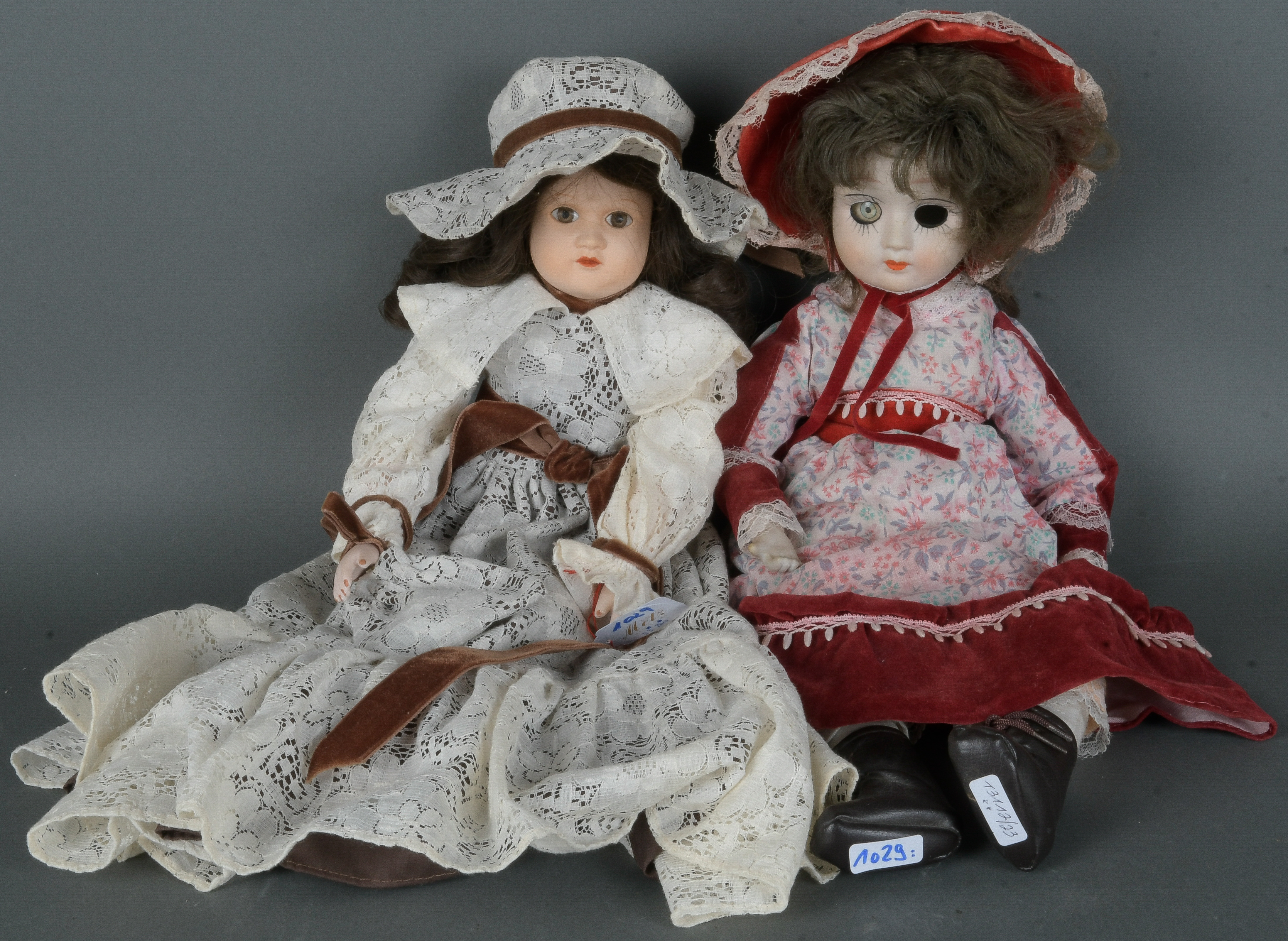 - Katalog-Nr: 1029Zwei Porzellankopfpuppen, eine verso bez. „WEV“, H=38 / 47 cm.o.L.