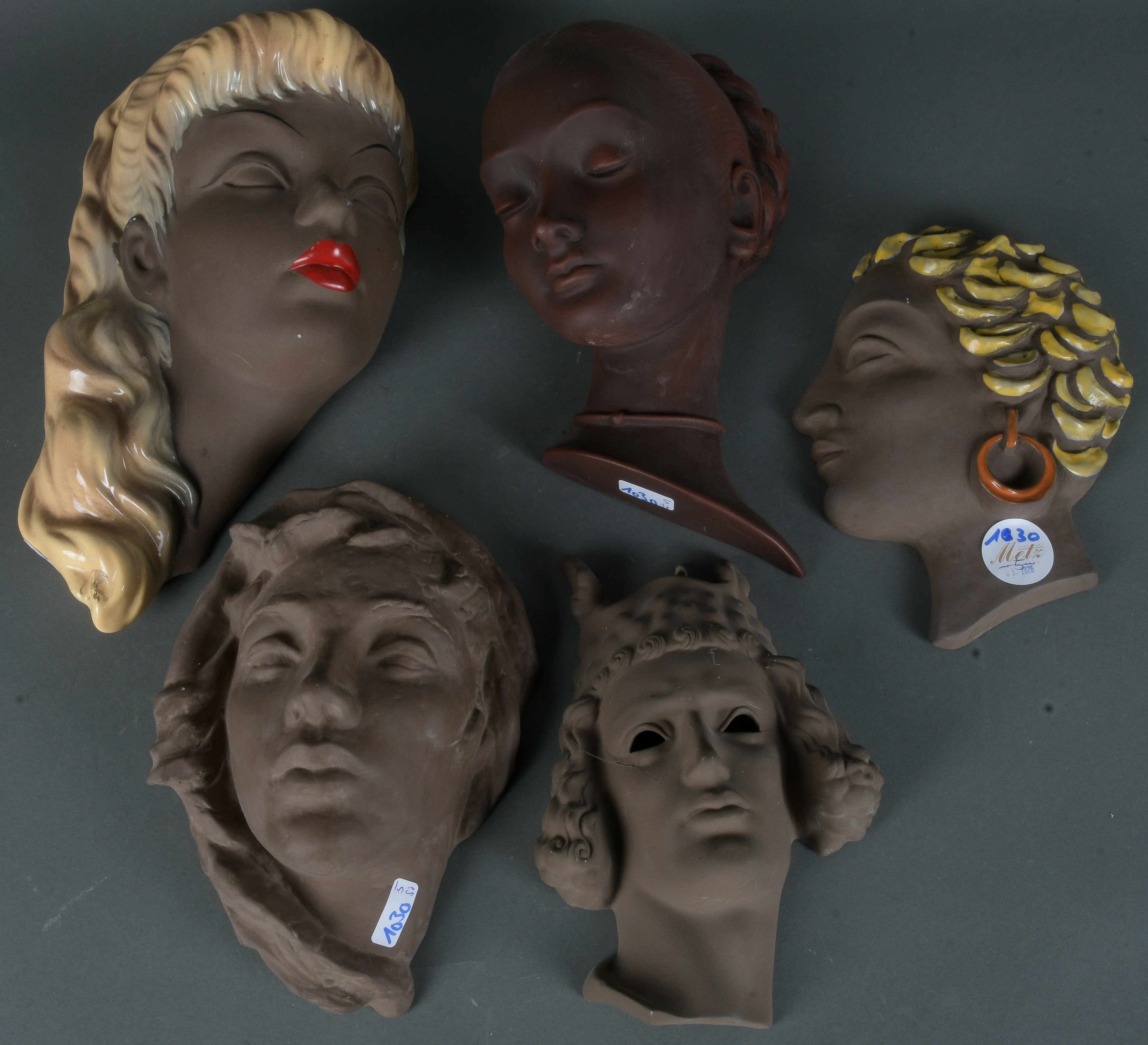 - Katalog-Nr: 1030Vier Wandreliefs „Mädchenkopf“ und Bamberger Reiter, u.a. Karlsruher Majolika 20. Jh. Irdenware, teilw. bunt glasiert, H=19 bis 31 cm.o.L.